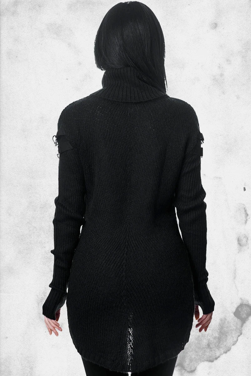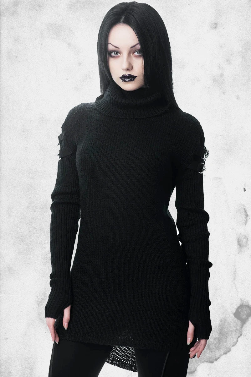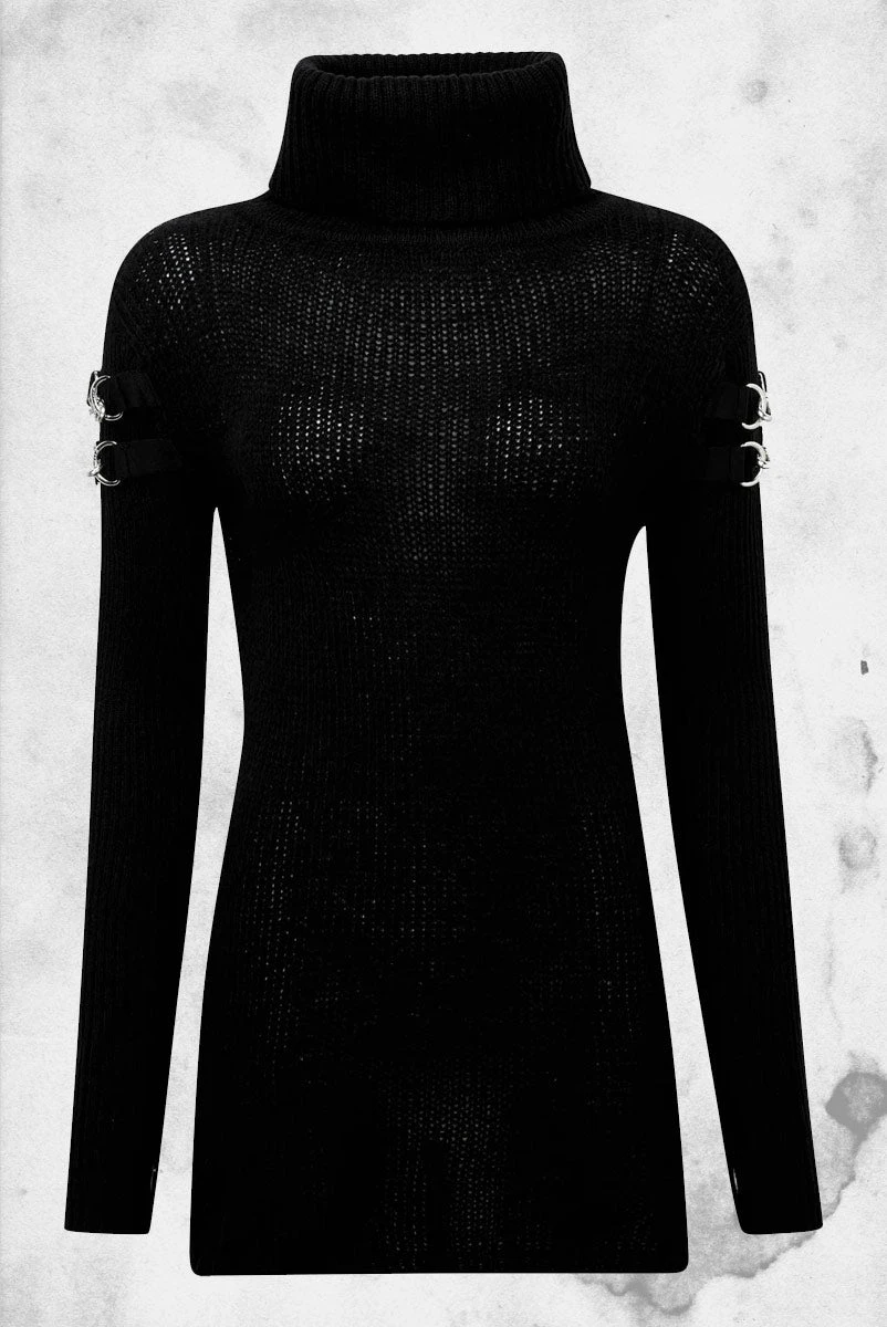 Winter is comin’ and be ready to welcome the darkness with the ‘Assimilate’ soft knit sweater. Featuring a soft knit structure with a high folded-neck, fitted long sleeves and extra-long body; perfect for layering. Adorned with contrasting D-ring and hardware. Dress it up or down with ease!