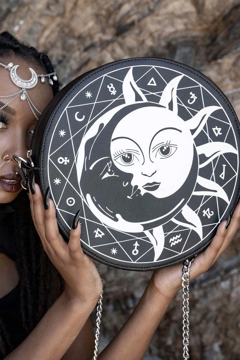 The classic-styled ‘Astral Light’ round handbag in a faux leather body with contrasting graphic print of a Sun & Moon. With zip closure and long chain strap. Perfect size for essentials and must-haves, with inside zip-pocket for keys, crystals, or whatever.