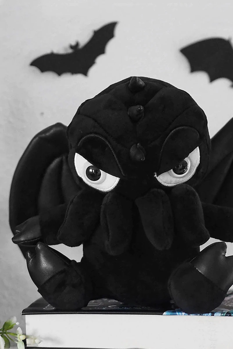 The spawn from the deep abyss – the cutest cosmic entity, the ‘Baby Cthulhu’ plush toy, standing large at 22.5cm of huggable soft plush fur, pitch-black features, faux leather wings and horns – with silvery moon-shade eyes. Perfect for gifting – or best of all, for yourself!