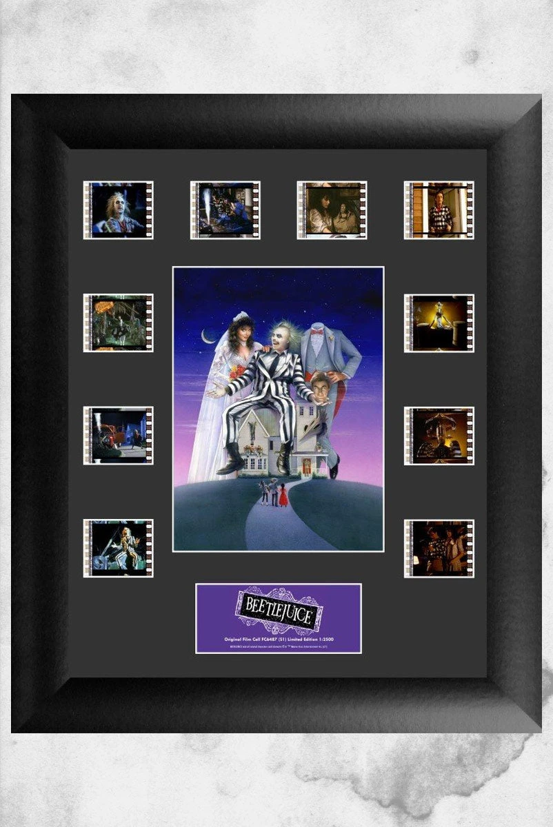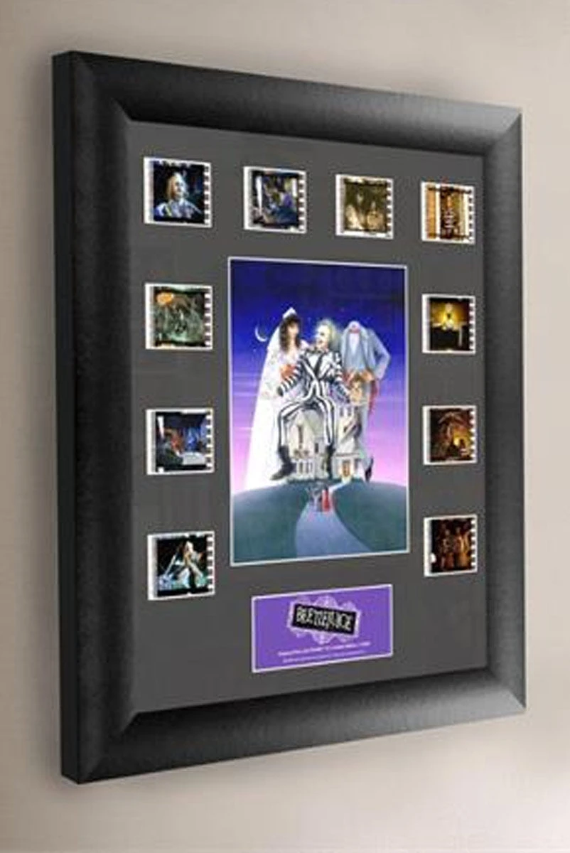 Relive the insanity of Tim Burton’s Beetlejuice with this FilmCells presentation! On this 11” x 13” Mini Montage FilmCells presentation are ten 35 mm carefully handcut film clips from the movie Beetlejuice surrounding an image of the beloved characters from Beetlejuice. This FilmCells presentation also features a numbered limited edition name plaque.