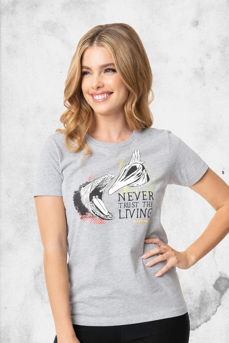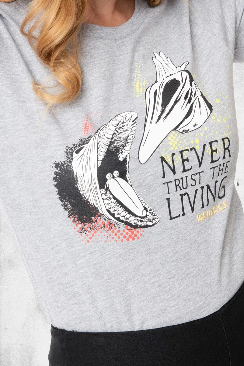It’s not stupid, you’re ghosts! An adorable women’s tee from Unique Vintage, this chilling collaboration with Beetlejuice features the ghastly screen print of Adam and Barbara in their horrifying transformations with the font, ‘Never Trust The Living’. Cast in a soft grey cotton knit with a crew neckline, long torso, and short sleeves, just don’t leave The Handbook lying around!
