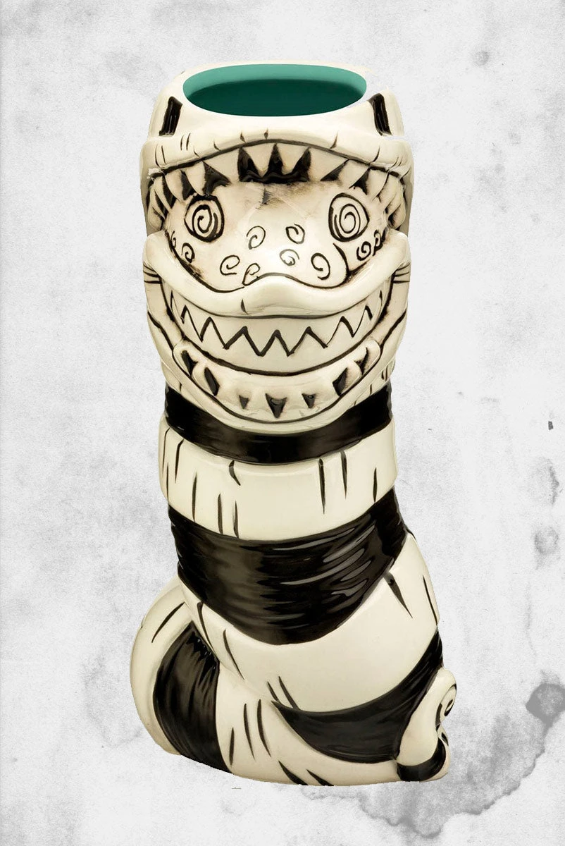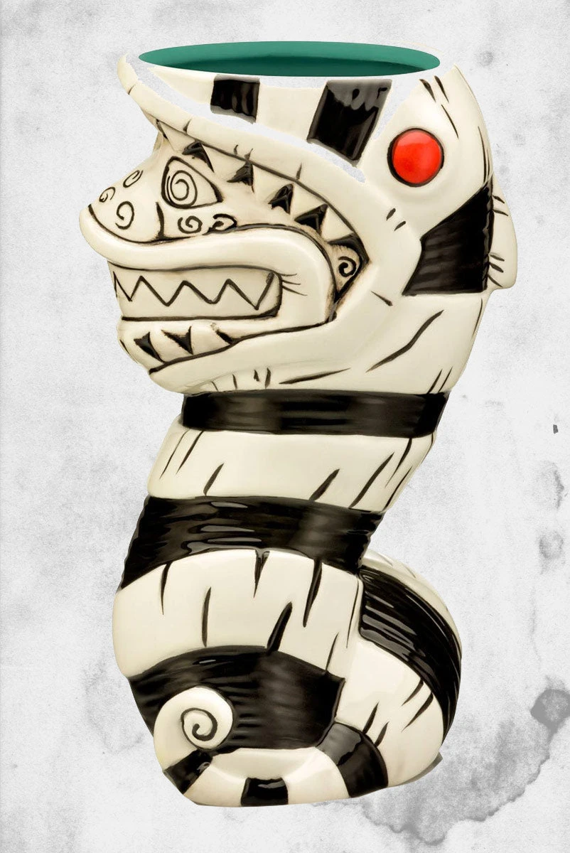 The Beetlejuice Sandworm 26 oz. Geeki Tikis Mug features a beautifully raised relief and measures approximately 8-inches tall x 4-inches wide x 4 3/4-inches deep, holding approximately 26 ounces. Full color, open box packaging. Hand wash only. Not dishwasher safe.
