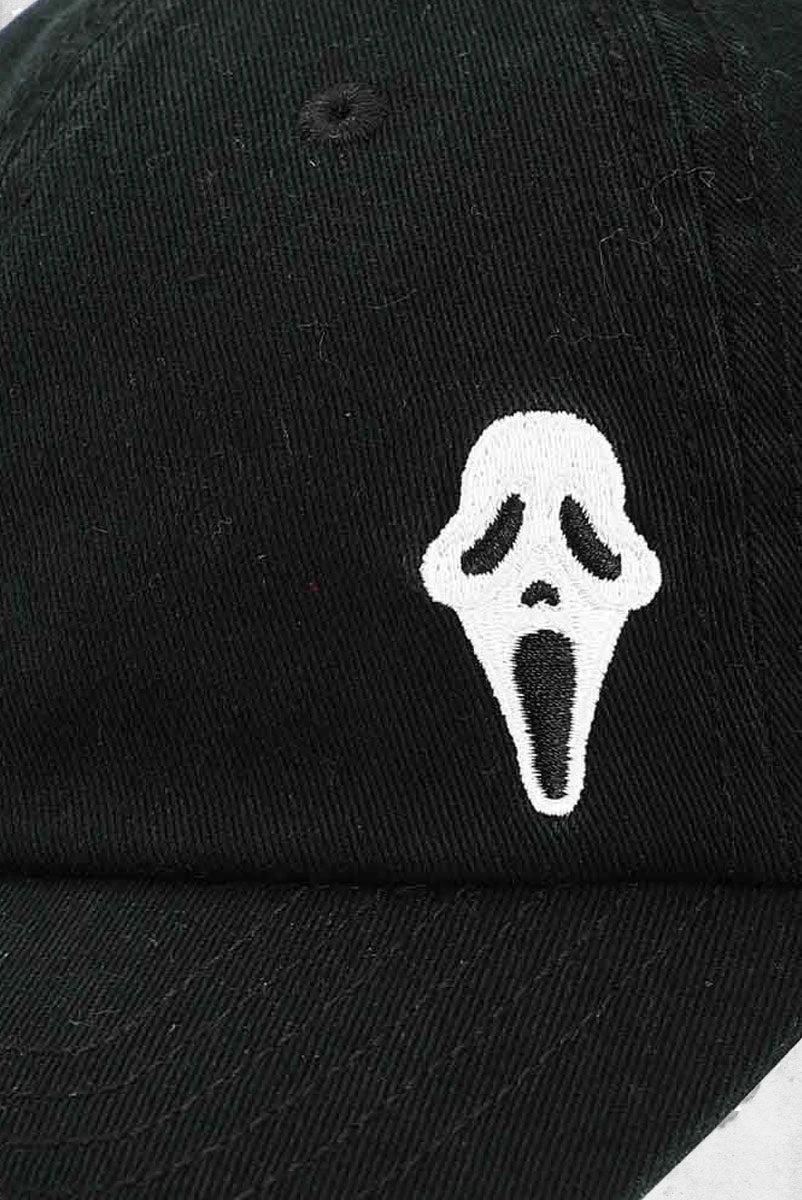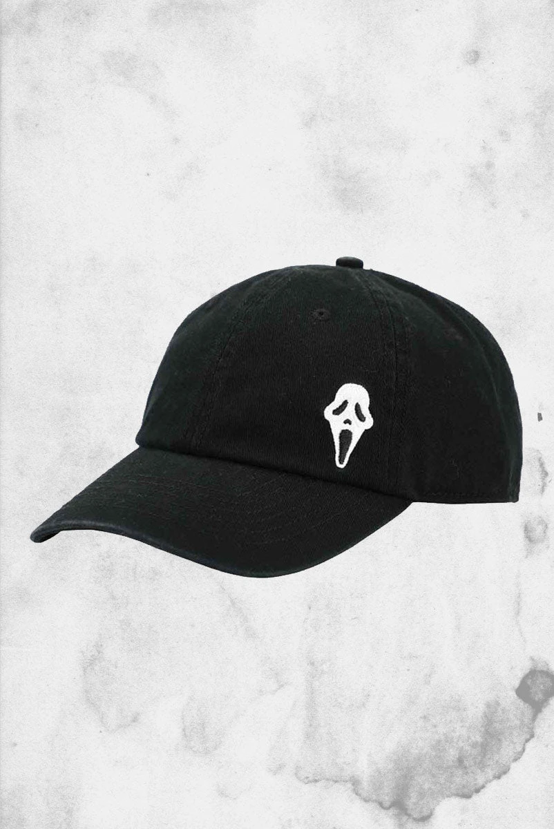 This Ghostface cap is perfect for any classic lover of horror. Featuring the iconic Ghostface from the classic series “Scream” embroidered small on the right side of a classic all black buckle dad hat.
