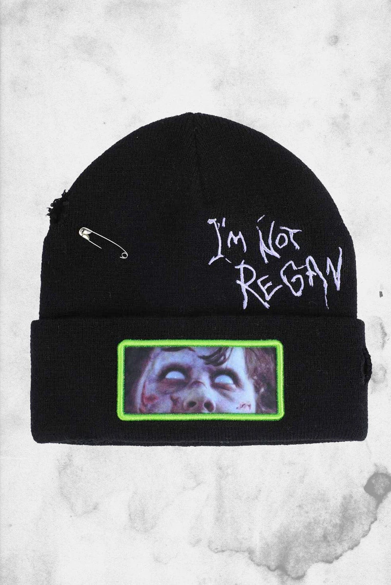 This The Exorcist beanie has been custom-designed to feature a safety pin, an embroidered “I’m Not Regan” detail, and a screengrab right from the movie, making it a must-have for any fan of the classic horror film.