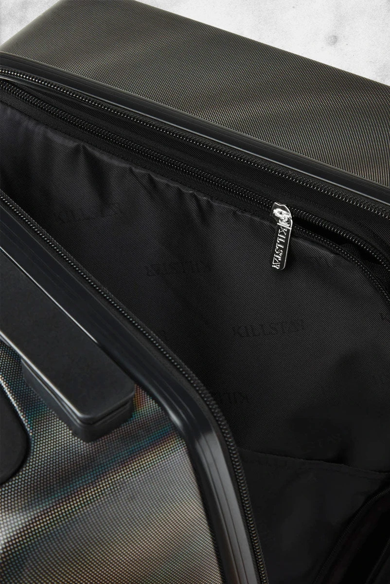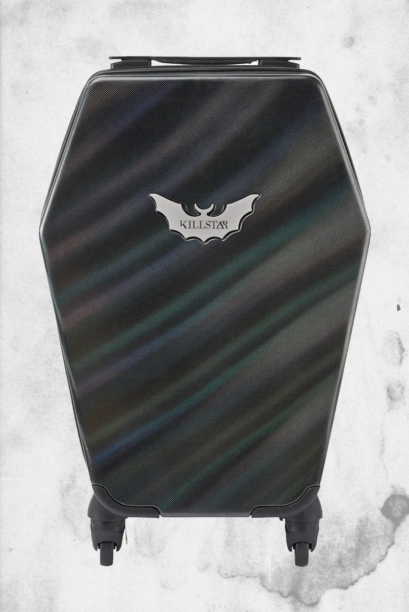 Bring a bit of magic on yer adventures out the crypt. Our super limited ‘Casket’ carry case will sure cause a stir on your trips to Transylvania. Hard protective case in a custom coffin mold, collapsible handle, and four wheels so you can be on a constant roll. Adorned with a contrasting silver bat-plaque. With zip closure, multi compartments and just the right size for your carry on!
