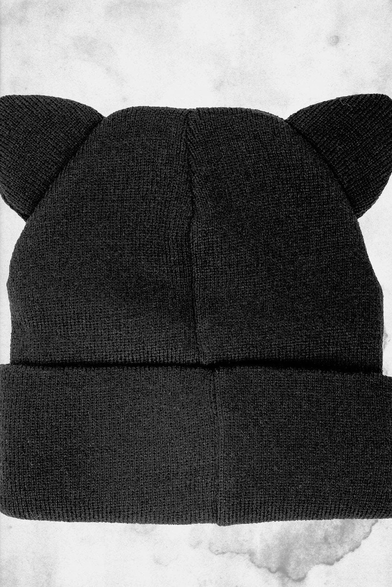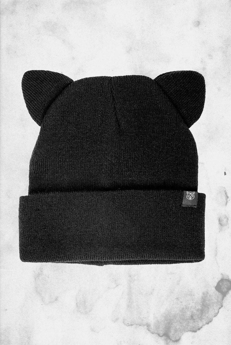 We designed the cutest hat to keep you warm throughout the season. It’s all black knit with cat ears. Detailed with the Sourpuss Jinx Cat flag label.