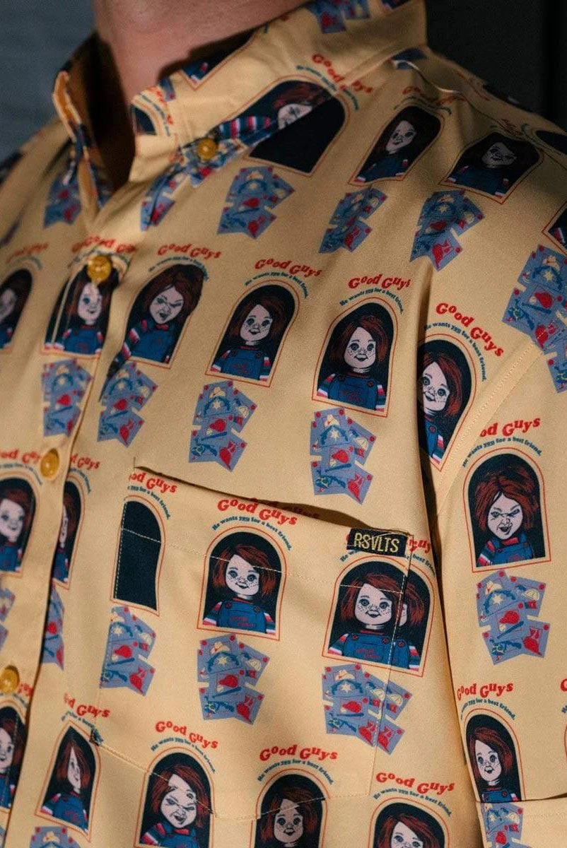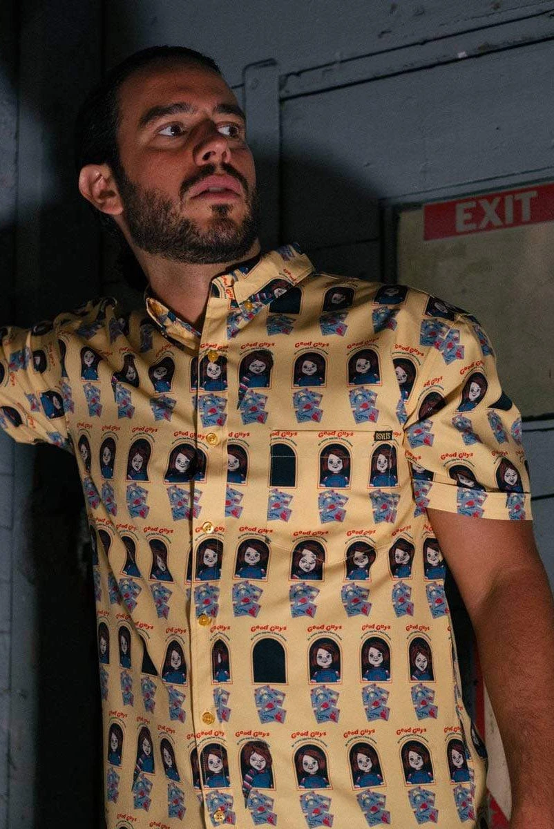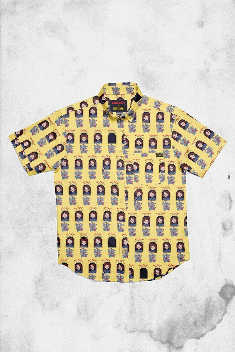 With this delightfully haunting KUNUFLEX™ button down, you get all three versions of a boxed and—gulp—unboxed Chucky.