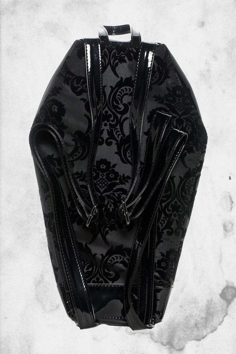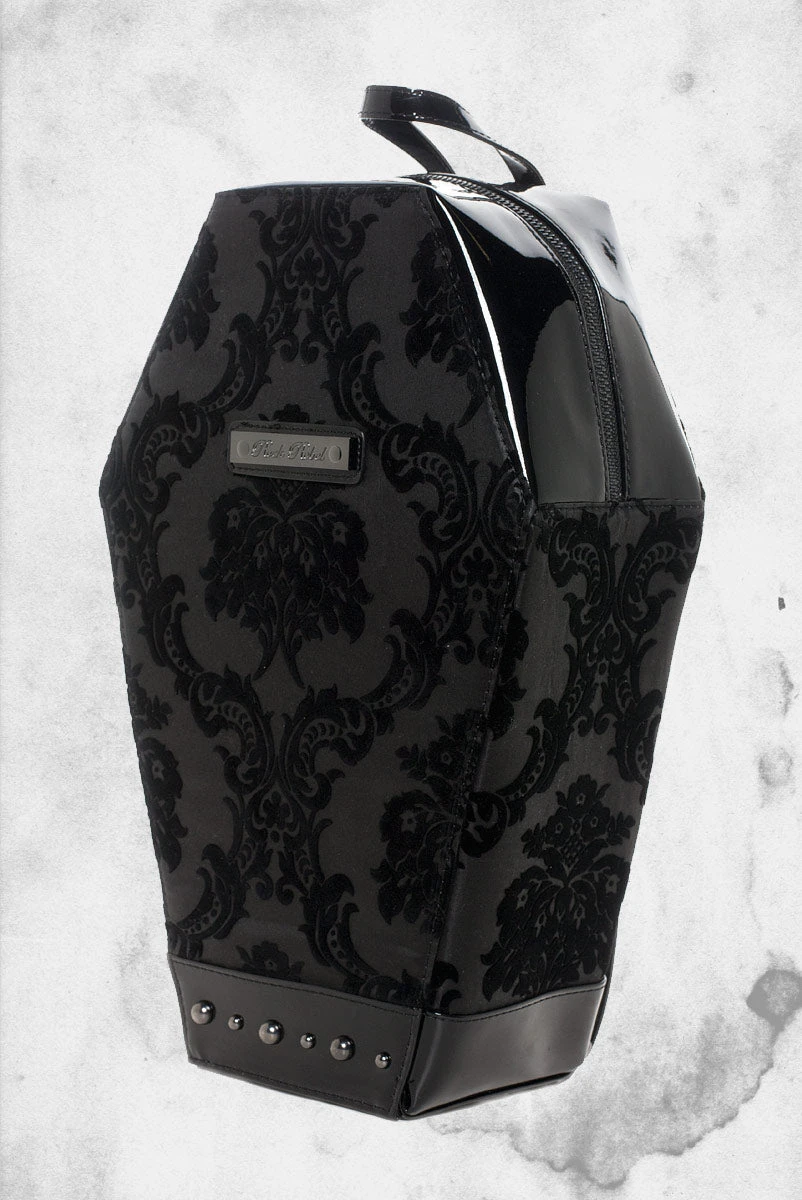 This coffin-shaped backpack from Rock Rebel features a black crushed velvet damask print on the front. Yes, we said coffin-shaped… now you can lay all your other backpacks to rest. Inside has spiderweb printed lining, velcro closure pocket and Rock Rebel label.