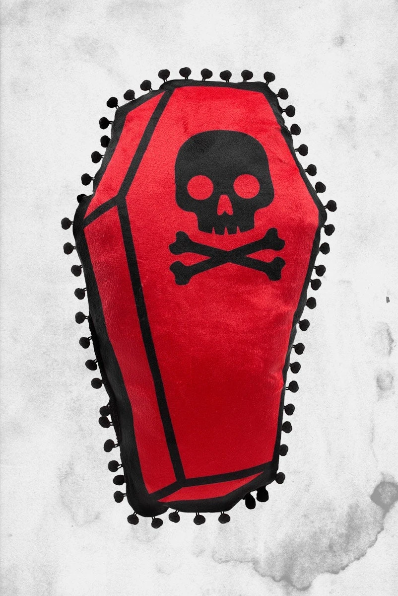 Rest in style and comfort with our Coffin Shaped Pillow! The outside is velvety soft and plush, with a red front side that’s complete with skull & bones. The backside is solid black and the whole morbid package is finished off with fun pom-pom trim. It’s deathly-good decor!