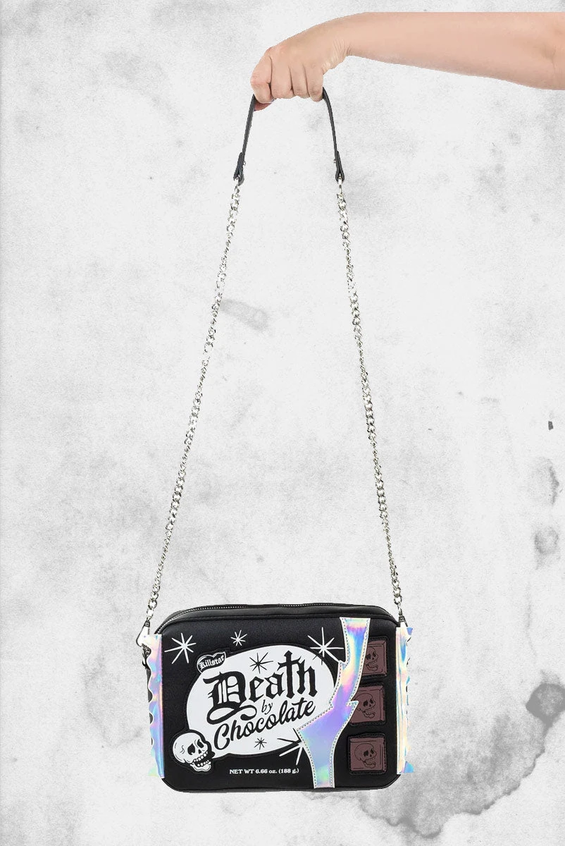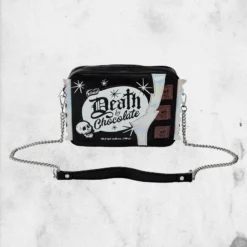 Do u have a sweet tooth? Have a nibble of the ‘Death By Chocolate’ handbag – the perfect snack for any outfit. Featuring a faux leather body with a fun graphic print and holographic contrasts, zip closure and inside zip-pocket, chain strap, and classic lining. Yummy!