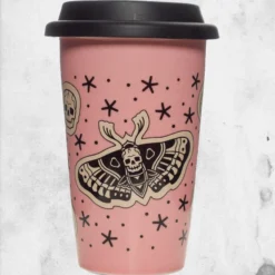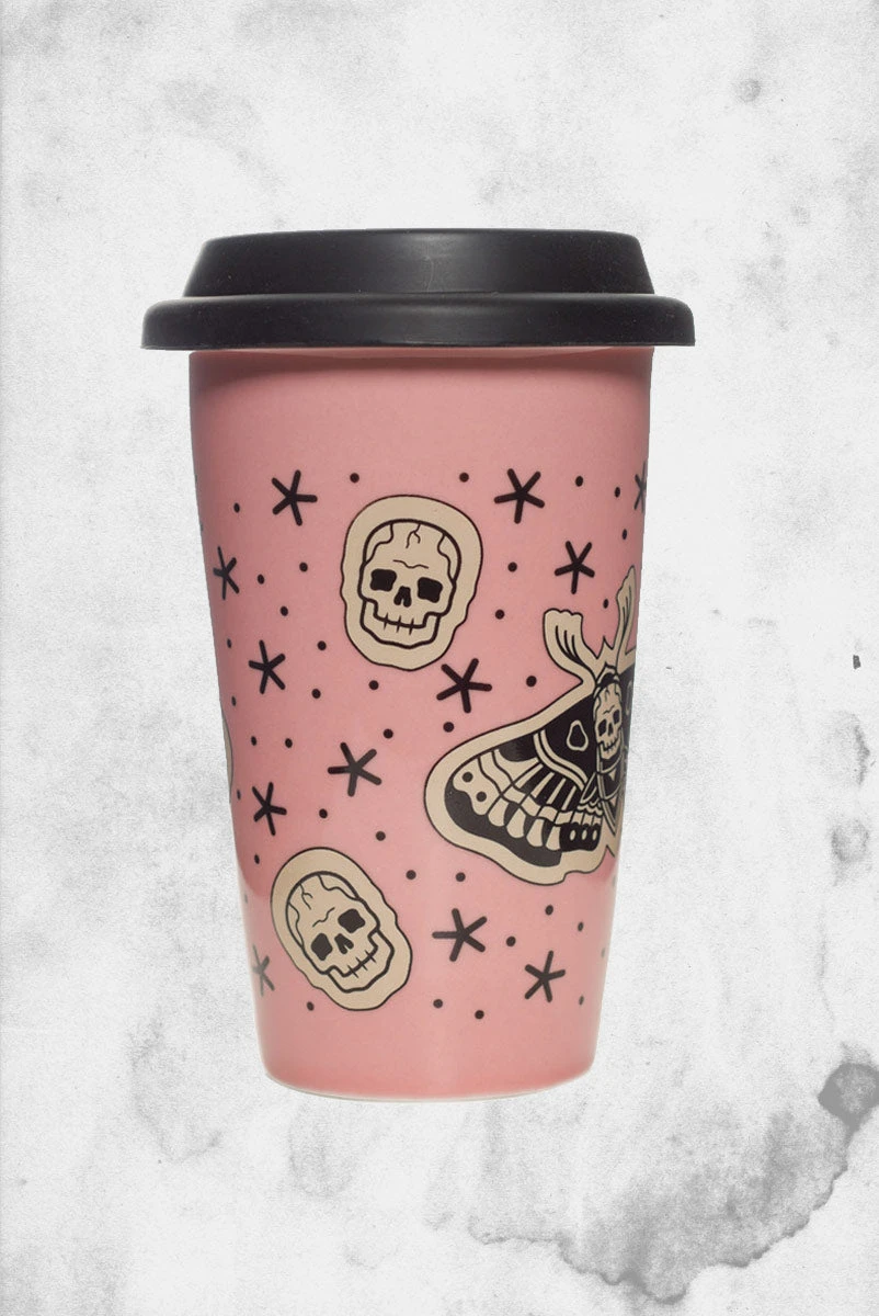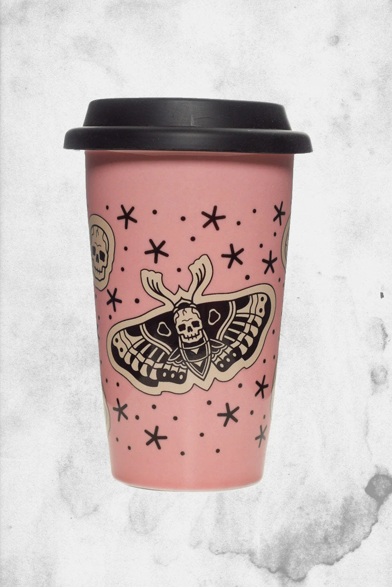 Take it to go with our Death Moth Tumbler! This travel mug is microwave & dishwasher safe, holds 12 oz. of your favorite beverage and comes with a removable silicone lid. Featuring an all-over Death’s Head Moth print on bubble-gum pink, we think you’ll be drawn to your coffee like a moth to the flame!