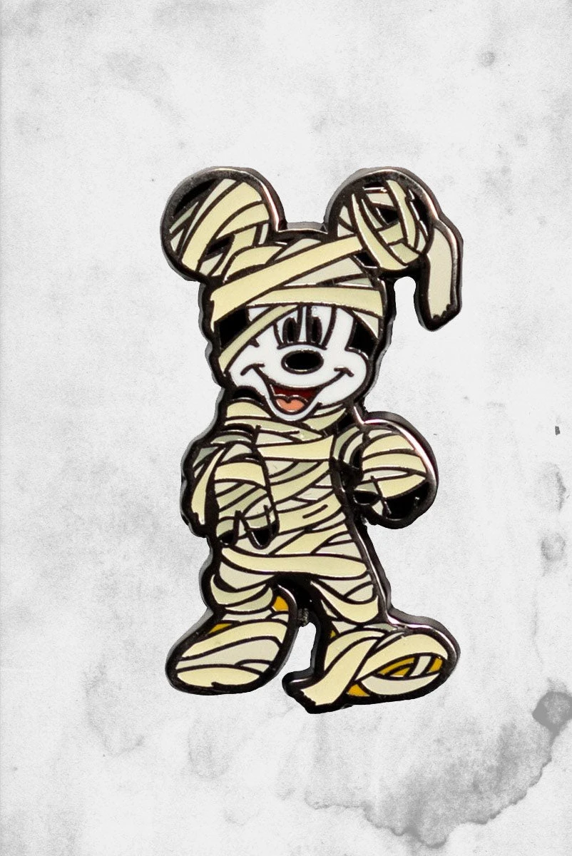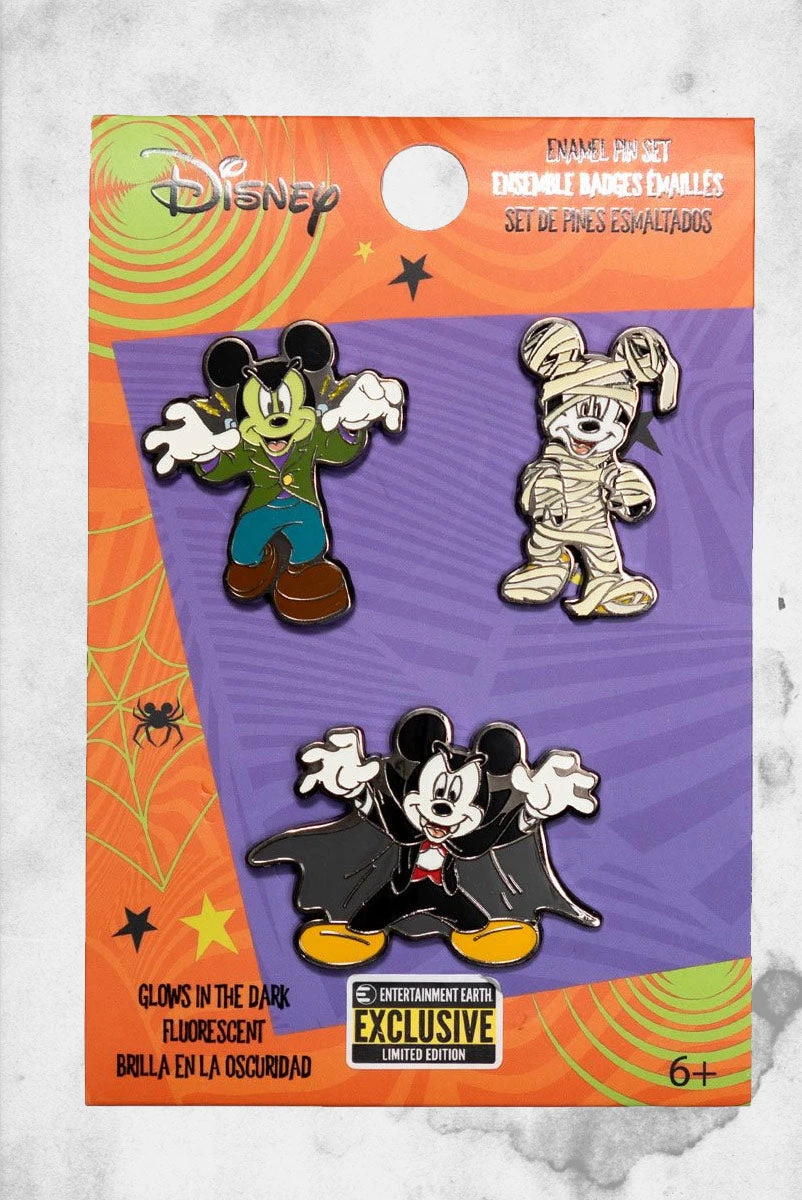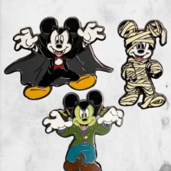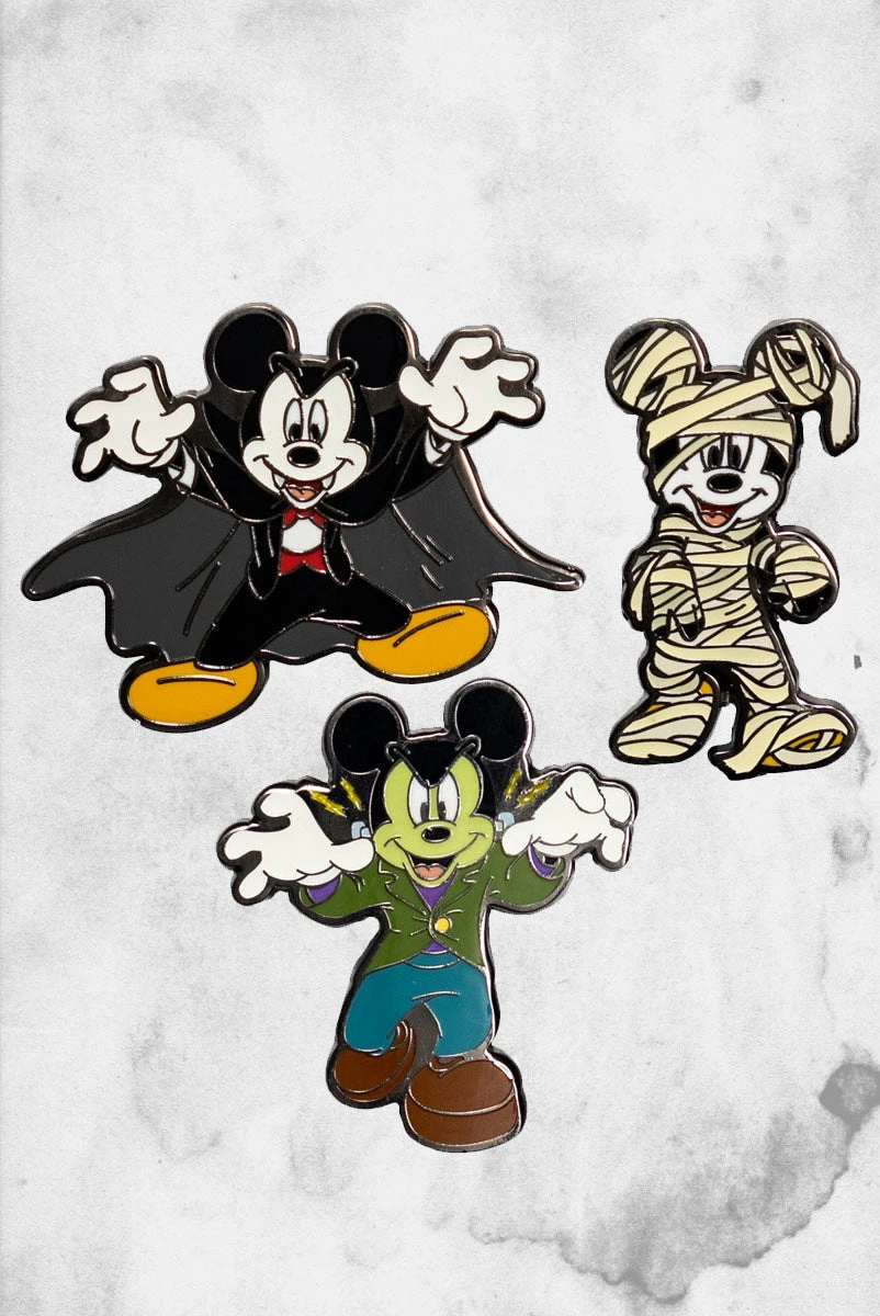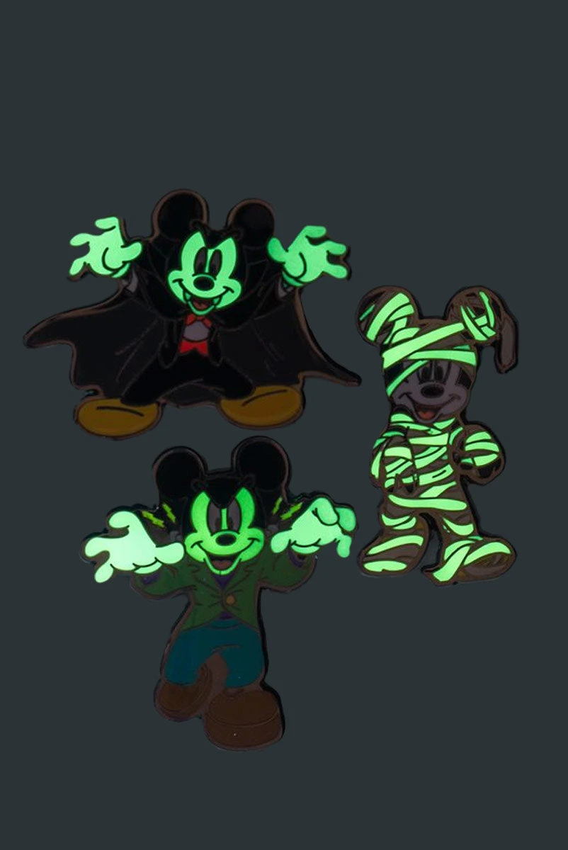 They spotlight Mickey in his favorite Halloween costumes – Mummy Mickey, Vampire Mickey, and Frankenstein Mickey. The pins measure approximately 1 1/2-inches and feature a glow-in-the-dark detail!