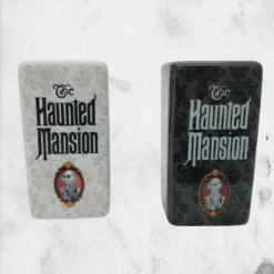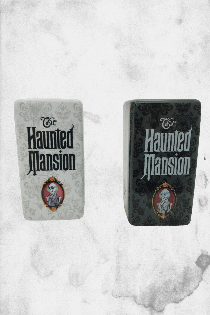 This salt and pepper set is inspired by the beloved Disneyland attraction where guests enter a foreboding estate and watch as the walls stretch and spirits meander. The Disney Disneyland Haunted Mansion Salt and Pepper Shaker Set feature the black and white chamber wallpaper and perusing portraits. The shakers are made of stoneware.