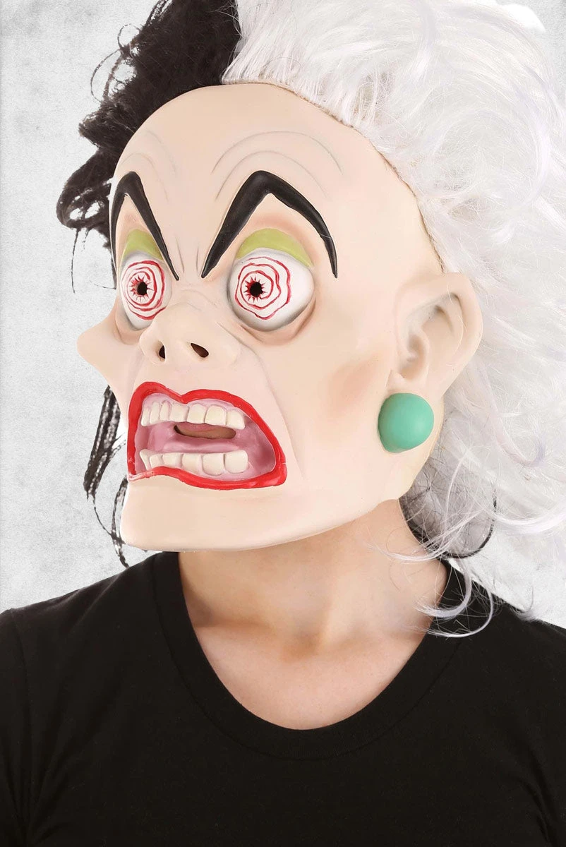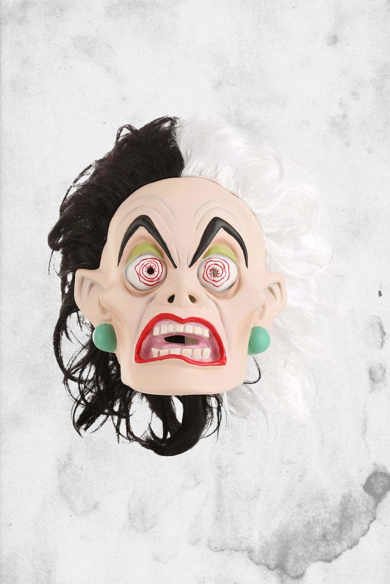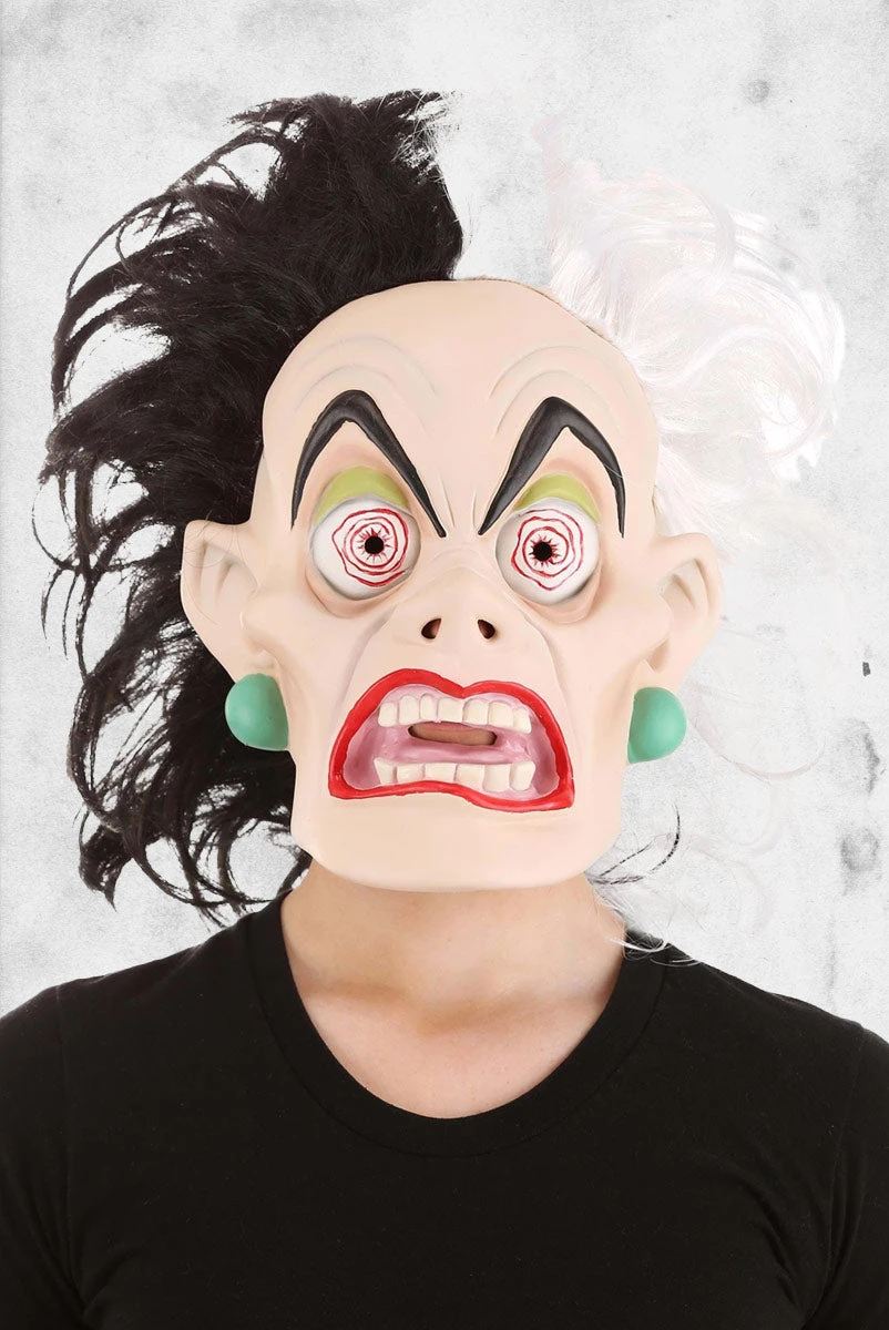 This fully-licensed Cruella De Vil mask from Disney will instantly transform you into the fashion-forward villainous that we all love. Only this time, she’s at her height of puppy mania! This latex mask is formed to create all sorts of fine details to create the perfect Cruella expression. Slipping over your whole head, the mask includes Cruella’s classic black and white hairdo for a truly unhinged look. Combine this with one of our fabulous Cruella De Vil costumes and you’ll look like you’re straight out of the original animated 101 Dalmatians film! Just be sure and refrain from driving when you’re in full Cruella De Vil mode.