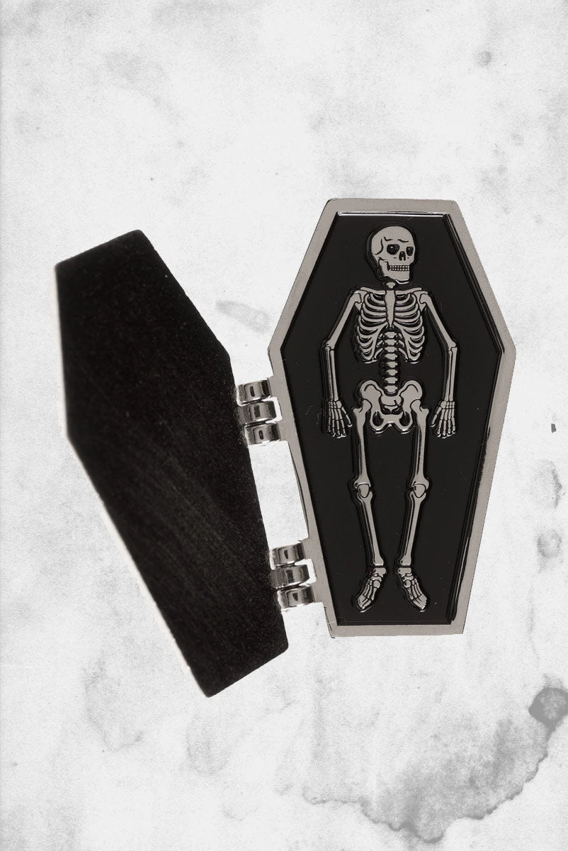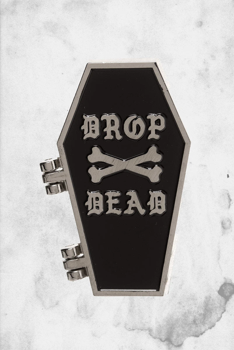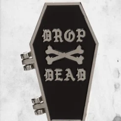 Our Drop Dead Coffin pin is an undead surprise that’s truly to die for! Our hinged Coffin pin will send your morbid message in style, with “Drop Dead” emblazoned on the front with a set of crossbones. Pull the coffin open to reveal a skeleton inside his final resting place. Double rubber clutch backing will keep this macabre treasure firmly attached to your favorite jacket, vest or bag.