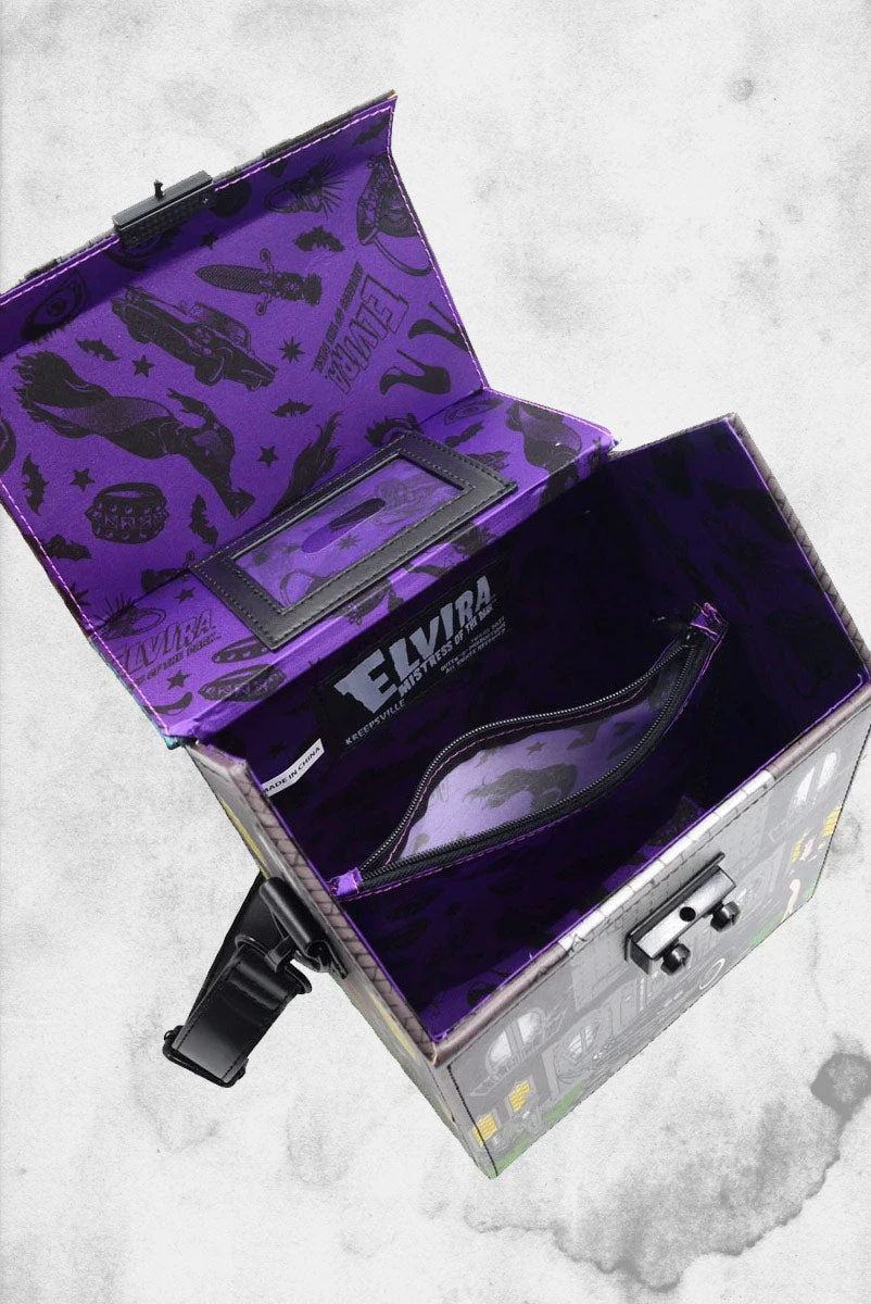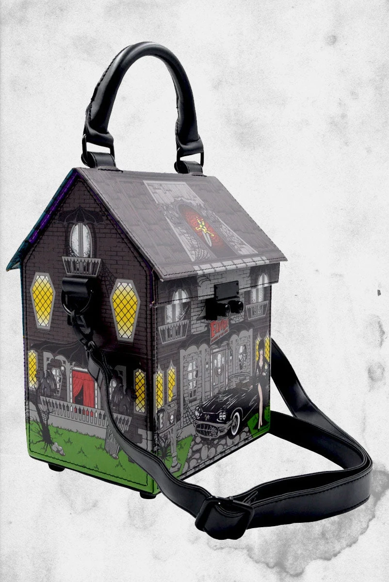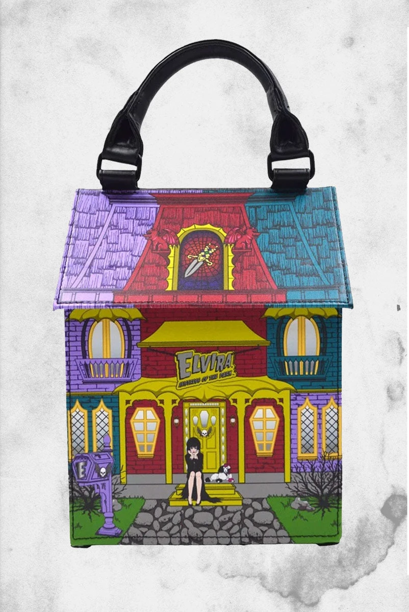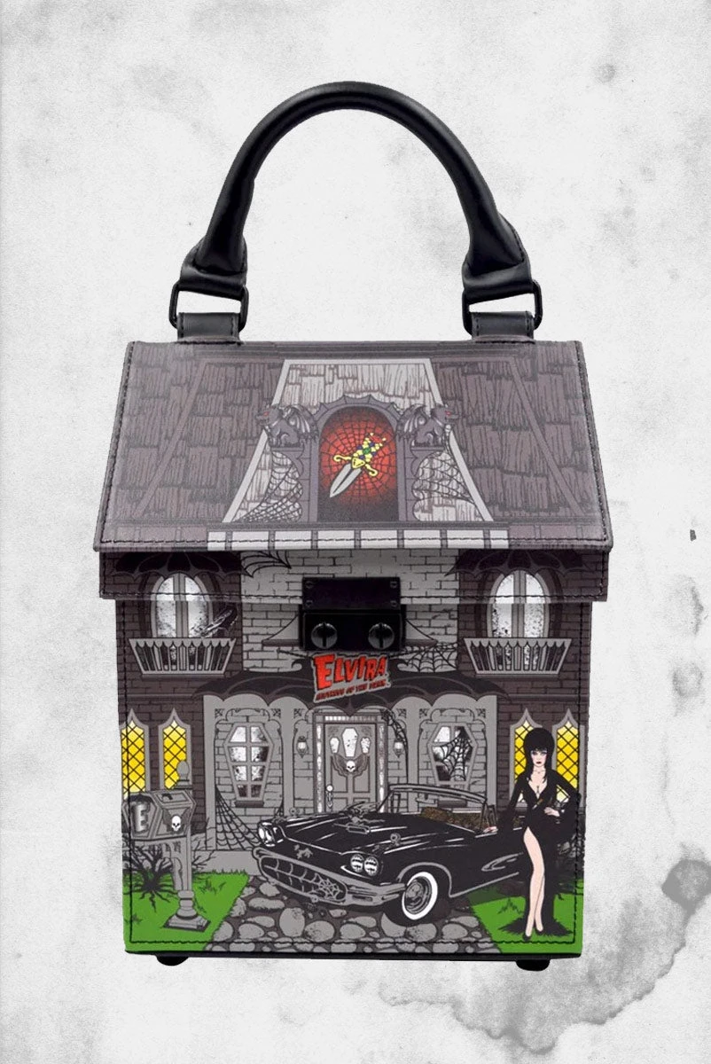 Did your aunt not leave you a haunted house in her will? Well now you can buy your own, with our officially licensed Elvira Haunted House Purse! Features Great-Aunt Morgana’s Mansion before and after the revamp. Front of the purse features the spooky and dark pre-vamp version of the manor. Back of the bag features the Elvira’s bright and colorful remodeling of the mansion! It has a detachable adjustable shoulder strap, inside ID pocket and a velcro detachable zip pocket divider that can be removed to make the purse one large compartment.