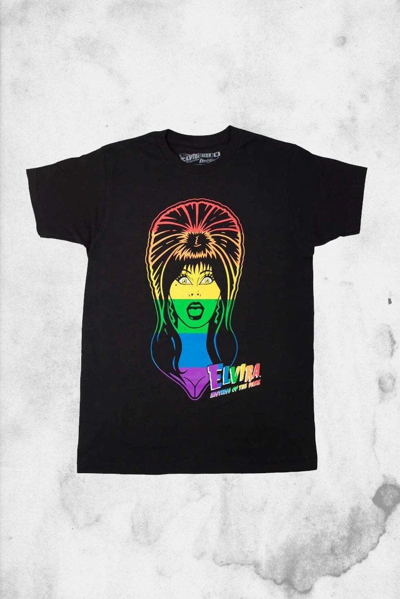 Officially licensed Elvira Pride Rainbow Face Shirt, featuring a rainbow Elvira head printed on a 100% cotton tee made by monsters in the USA. 13% of all net profits from the Elvira pride collection will be donated the Los Angeles LGBTQIA+ center!