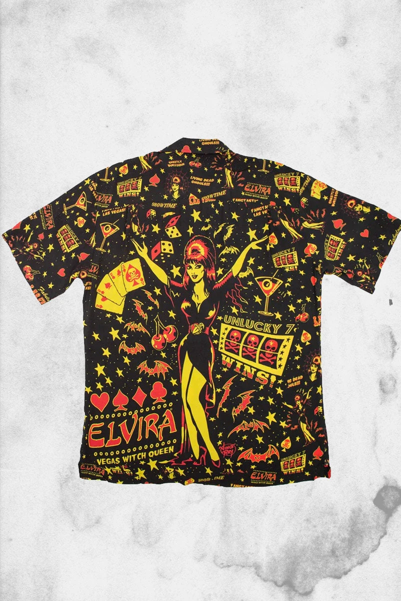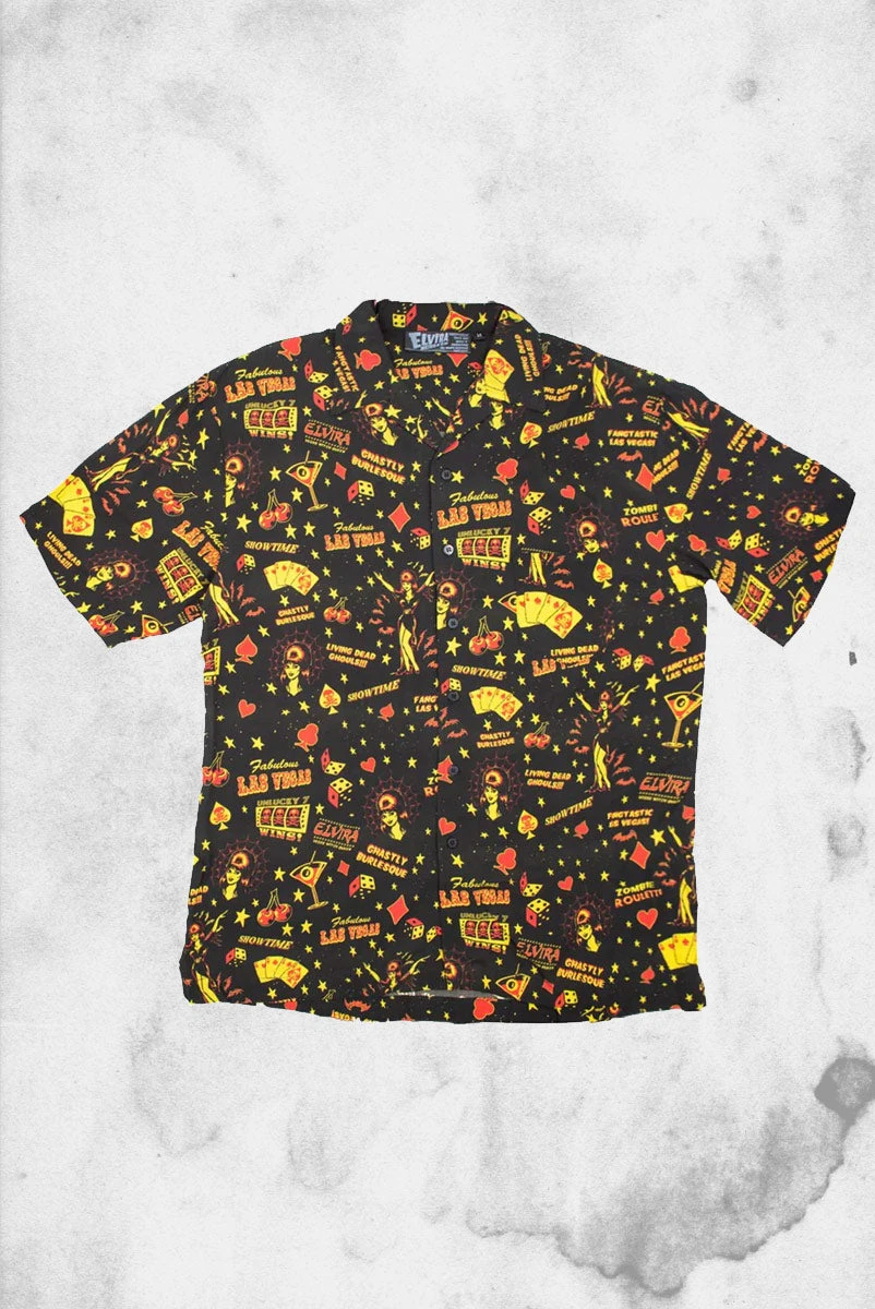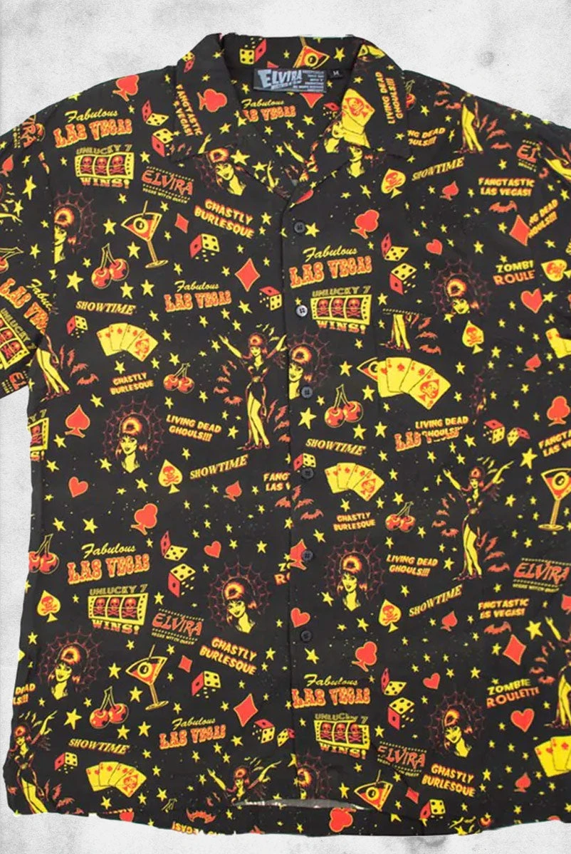 Official Elvira Mistress of the Dark men’s all over print button down shirt. It’s Vegas AND bust with this loose fit sublimated rayon shirt featuring all over red pinball machine artwork of Elvira.