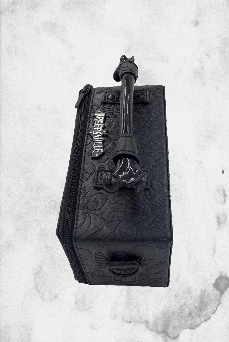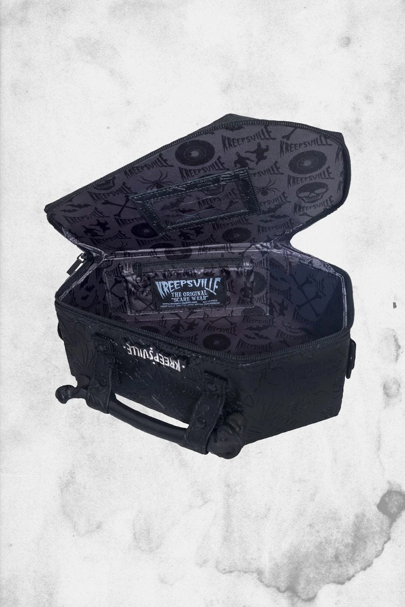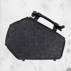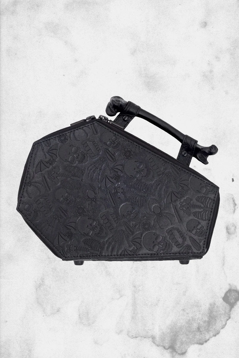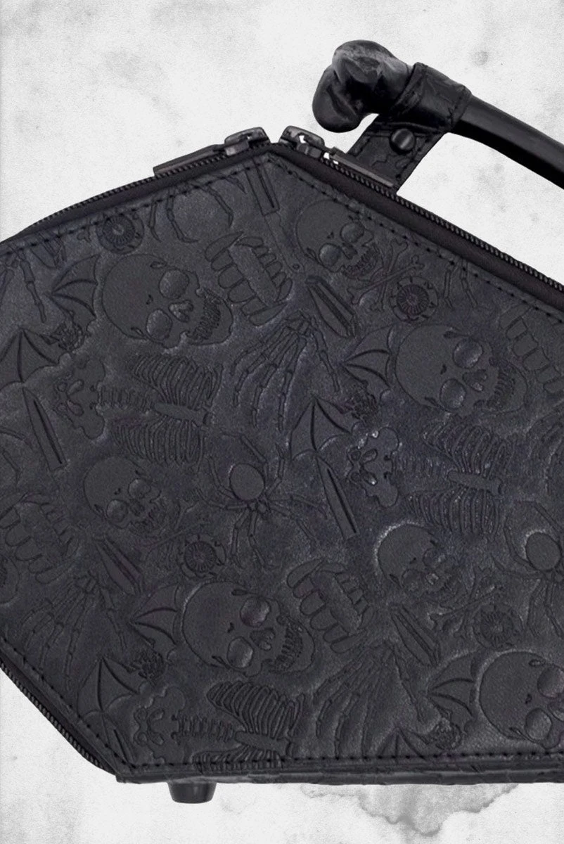 This Coffin purse features an Embossed Skull Coffin Purse featuring a replica bone side handle, PU fabric with all over spooky Embossed Skull Coffin print, detachable shoulder strap chain, and inside ID pocket.