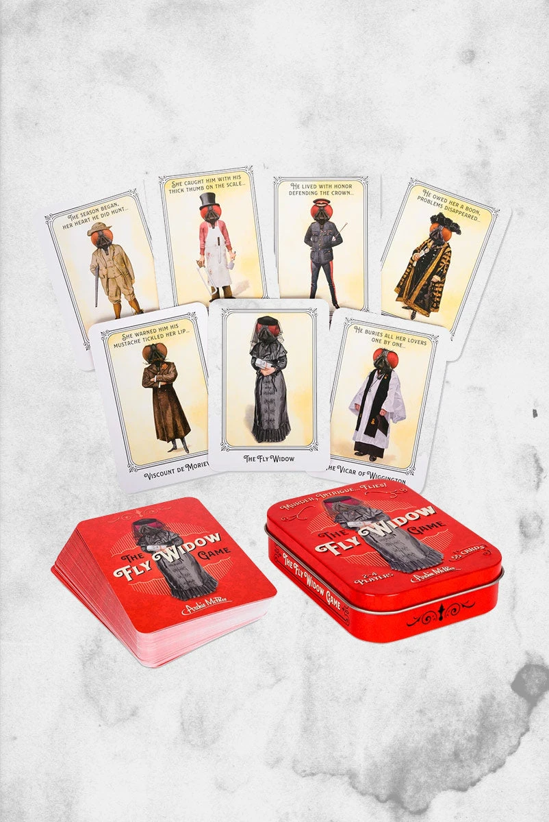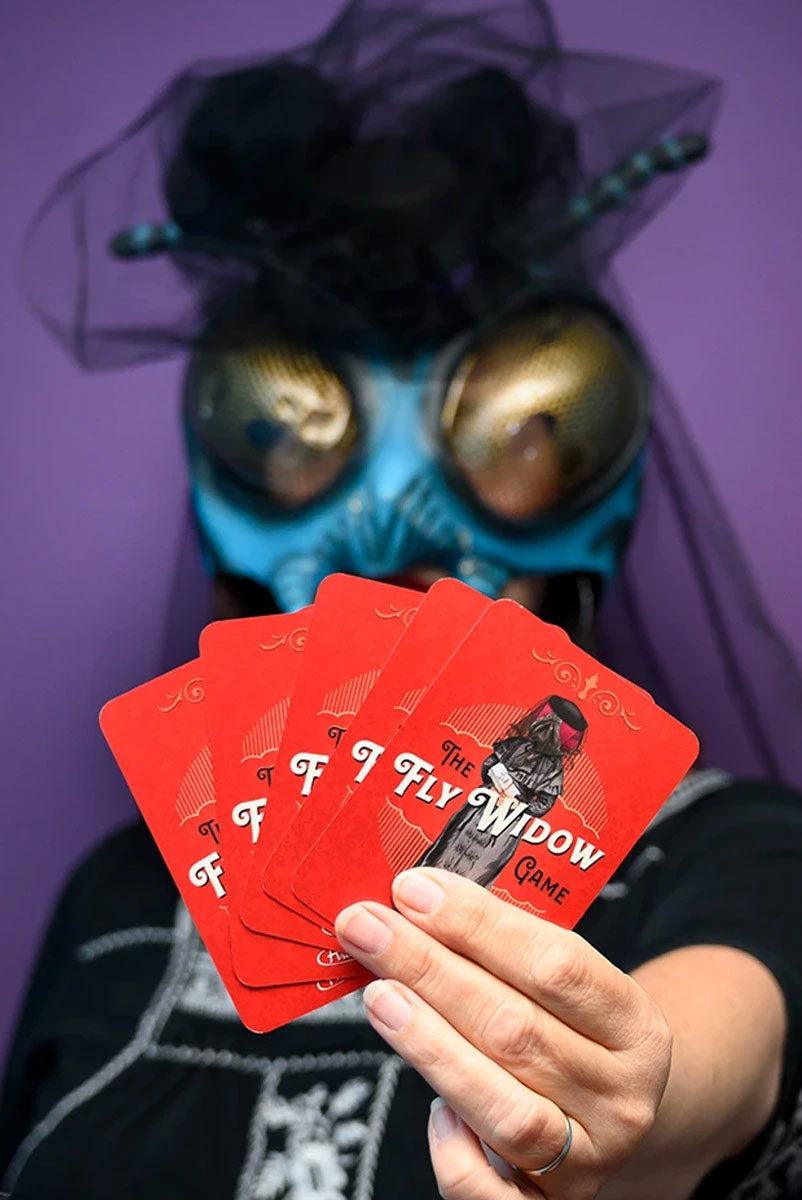 This game, with the same rules as Old Maid, is based on the story of London’s Fly Widow. She was all the buzz in the insect world of the 1880s. A brilliant woman, she found that society would not recognize what she achieved on her own. Each accomplishment was attributed to her husband, so her solution was to have a lot of husbands. Of course, after the initial rush of a new relationship, she quickly tired of their requests to dim her own flame. As this happened, each husband would meet his demise. As you match the husbands during the game, you complete a humorous couplet that describes their death.