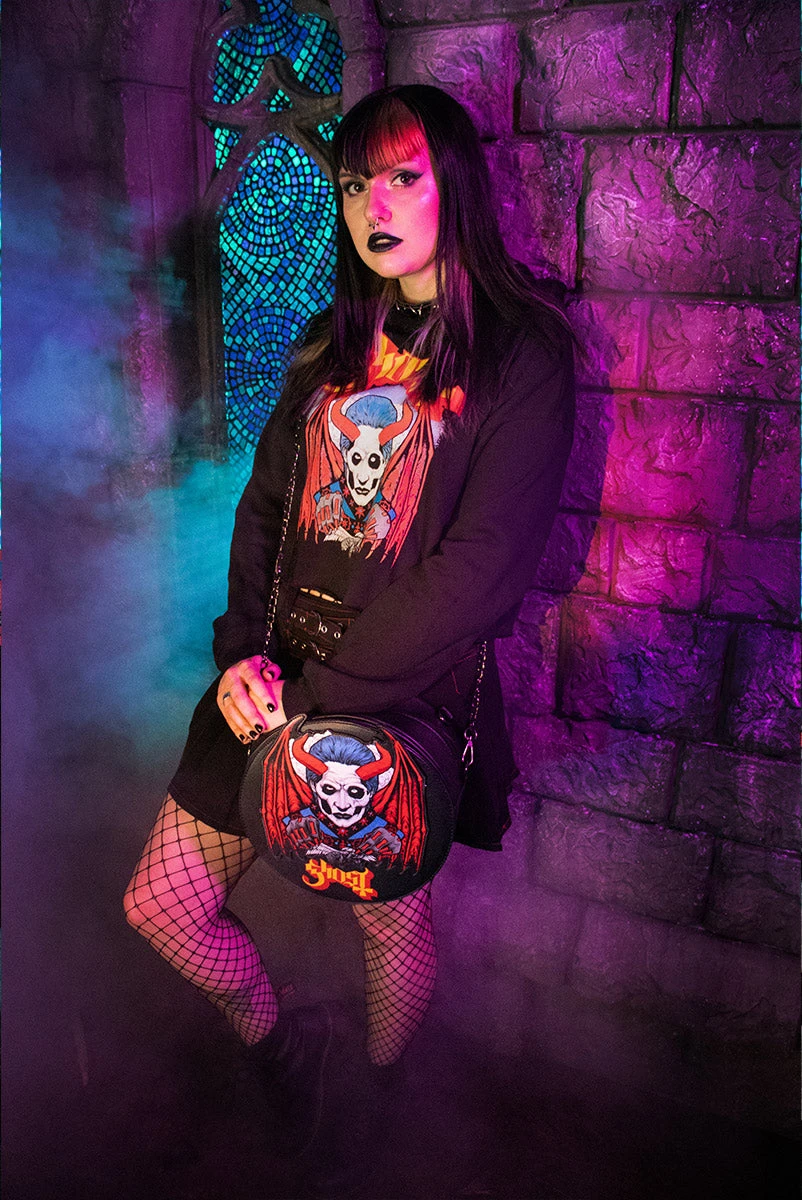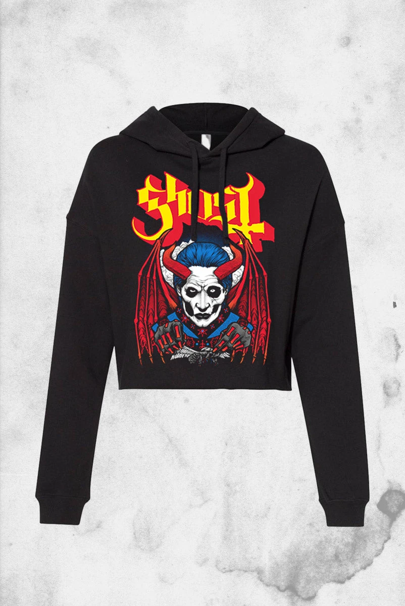 This officially licensed Post Mortem Horror Bootique x Ghost cropped hoodie is a must for any fan of the Grammy Award winning band. The cropped hoodie features a Horned and winged motif of Papa Emeritus IV on the front. Pairs perfectly with our Demonic Shapeshifter Faceplate.