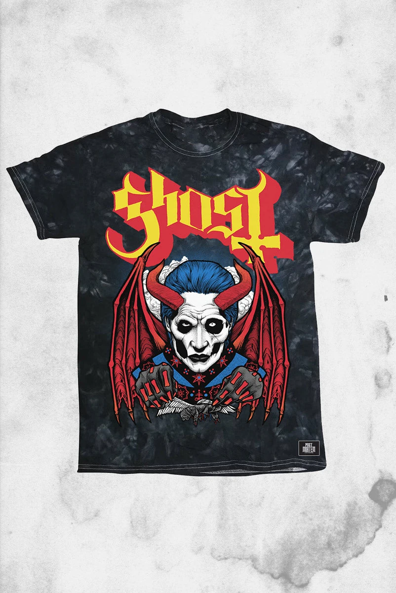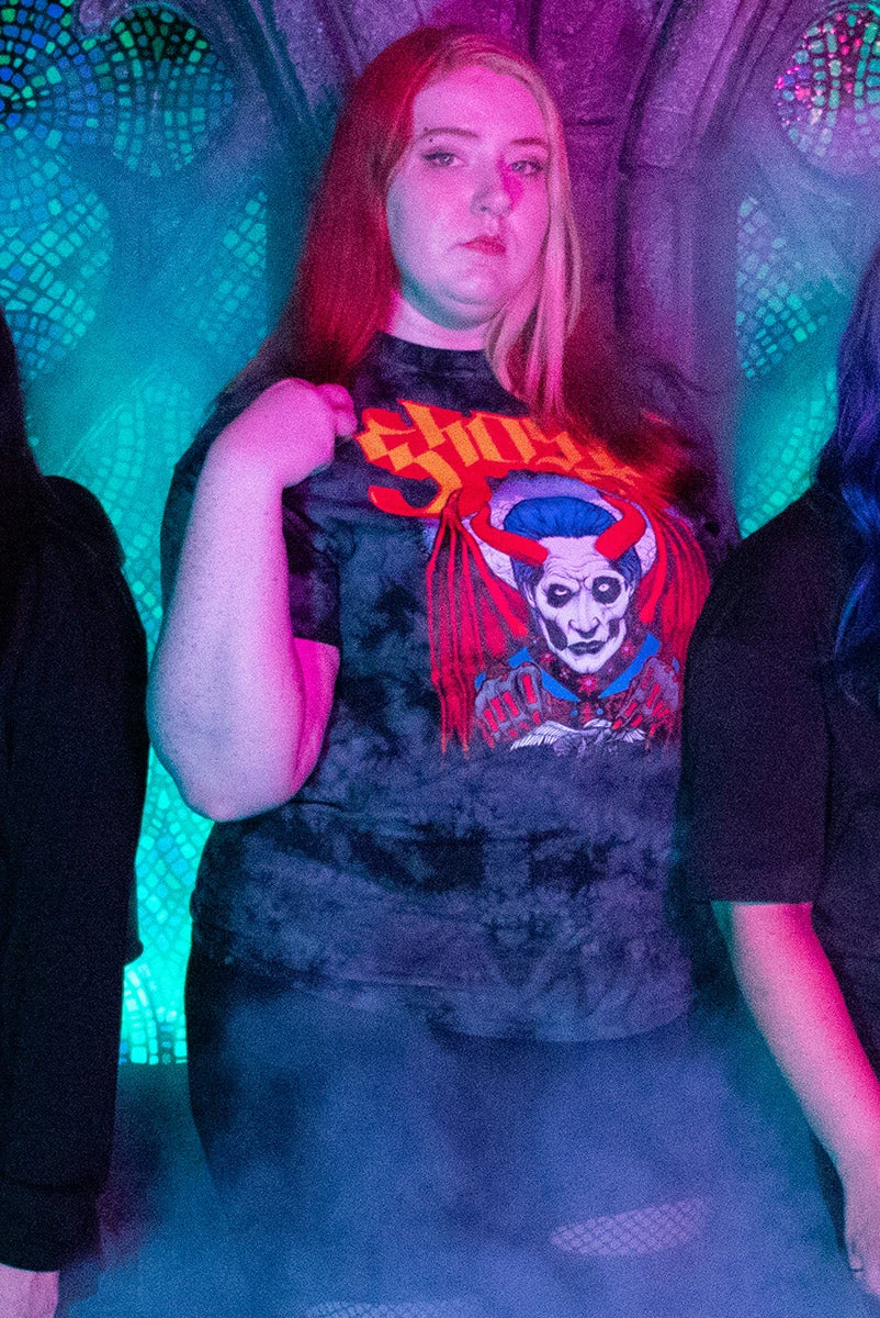 This officially licensed Post Mortem Horror Bootique x Ghost tie-dye t-shirt is a must for any fan of the Grammy Award winning band. The cropped hoodie features a Horned and winged motif of Papa Emeritus IV on the front and the overall shirt is grey and black tie-dye. Pairs perfectly with our Demonic Shapeshifter Faceplate.