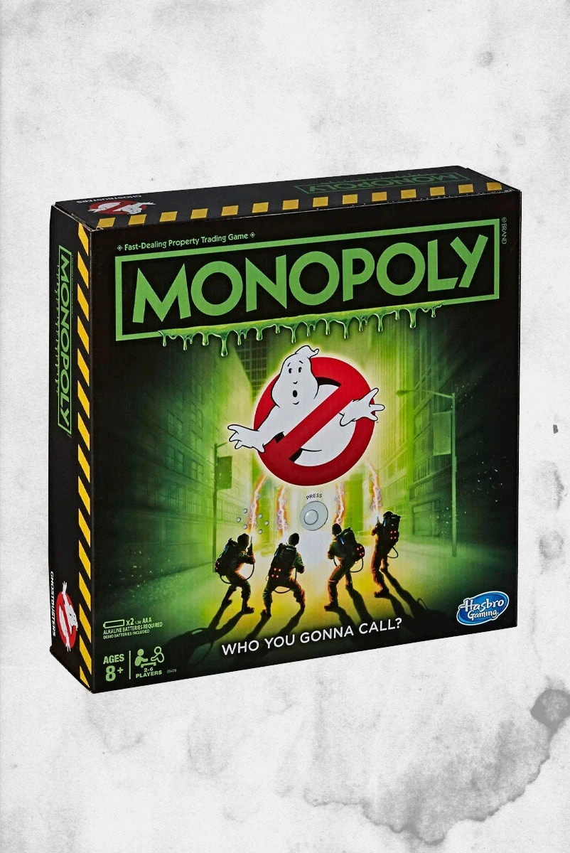 In this Monopoly Board Game: Ghostbusters Edition, players travel around the board buying up Ghostbusting contracts. The game features scenes, characters, tokens, and artwork inspired by the original Ghostbuster movie. Landing on a Supernatural Entity space has players teaming up to battle Slimer, Stay Puft, Library Ghost, or Vinz Clortho to save the city! The last player with petty cash when all other players have gone bankrupt wins!