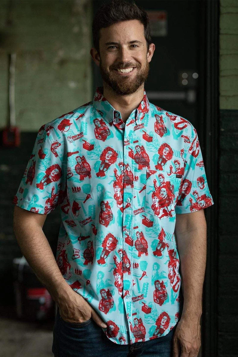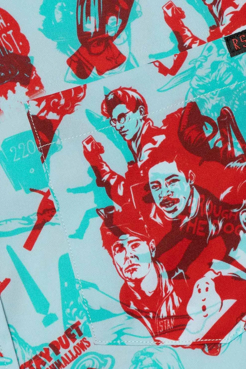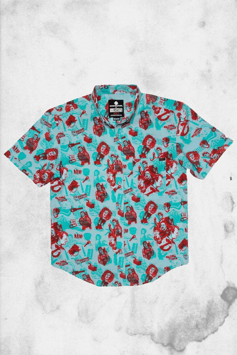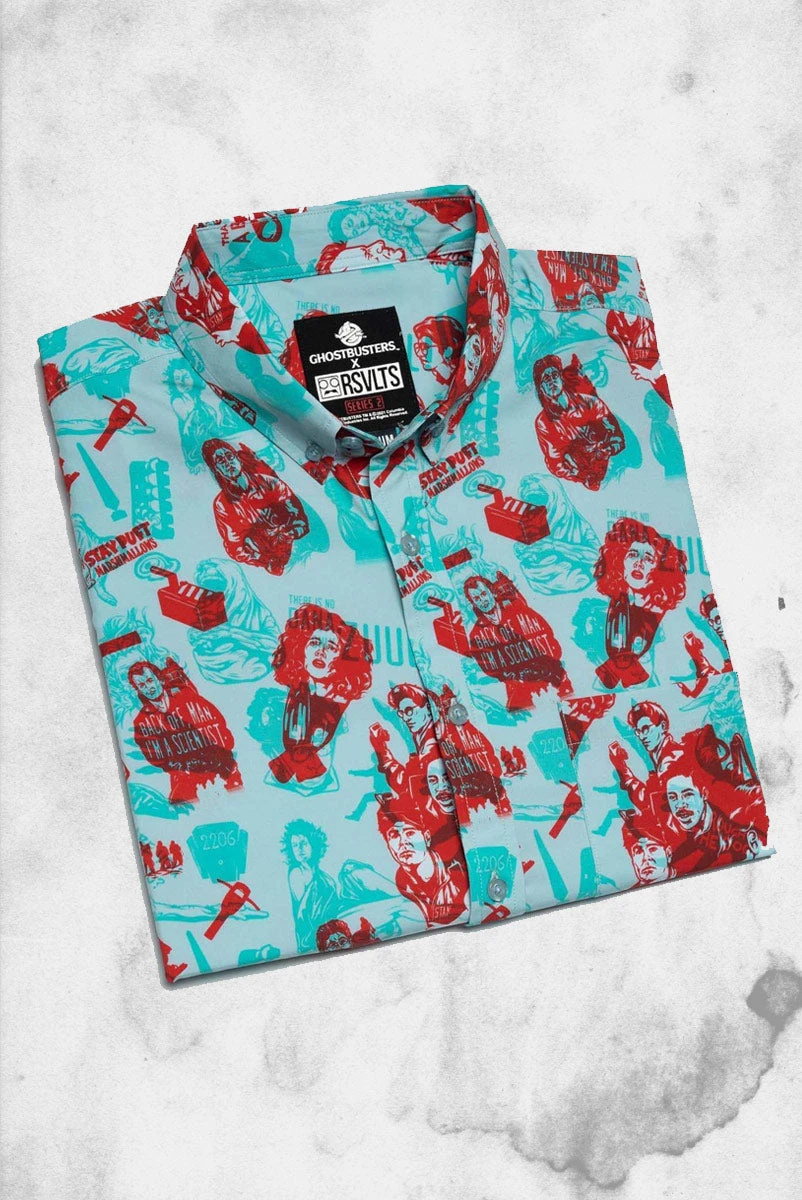 The classic two-tone decoder style pattern on this KUNUFLEX™ button down has the good guys in red and the bad guys in blue. Thanks to a special decoder hangtag included with the shirt, you can look through and see all the bad guys caught in the Ghost Trap. How about that for innovation? Back off! We’re scientists.