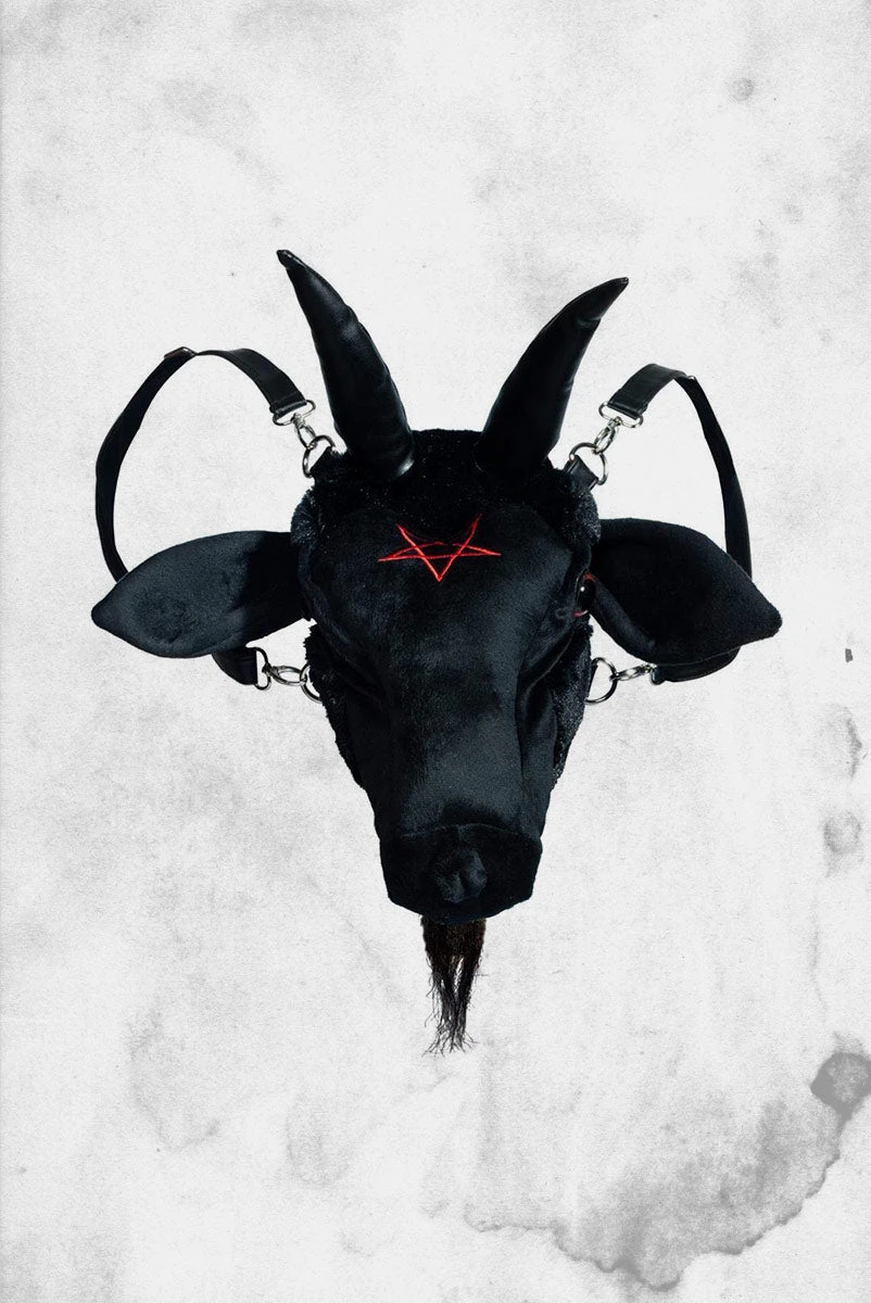 Goathead Baphomet plush purse / bag / backpack. Multi way strap system that can be worn as a backpack, shoulder purse or cross body bag. Super soft plush with embroidered pentagram, demonic red bead eyes, vinyl horns and back, tufted beard and deep interior that fits most combos of phone, wallet ect, zip closure with coffin zip pull. Super Evil-Super Cute .