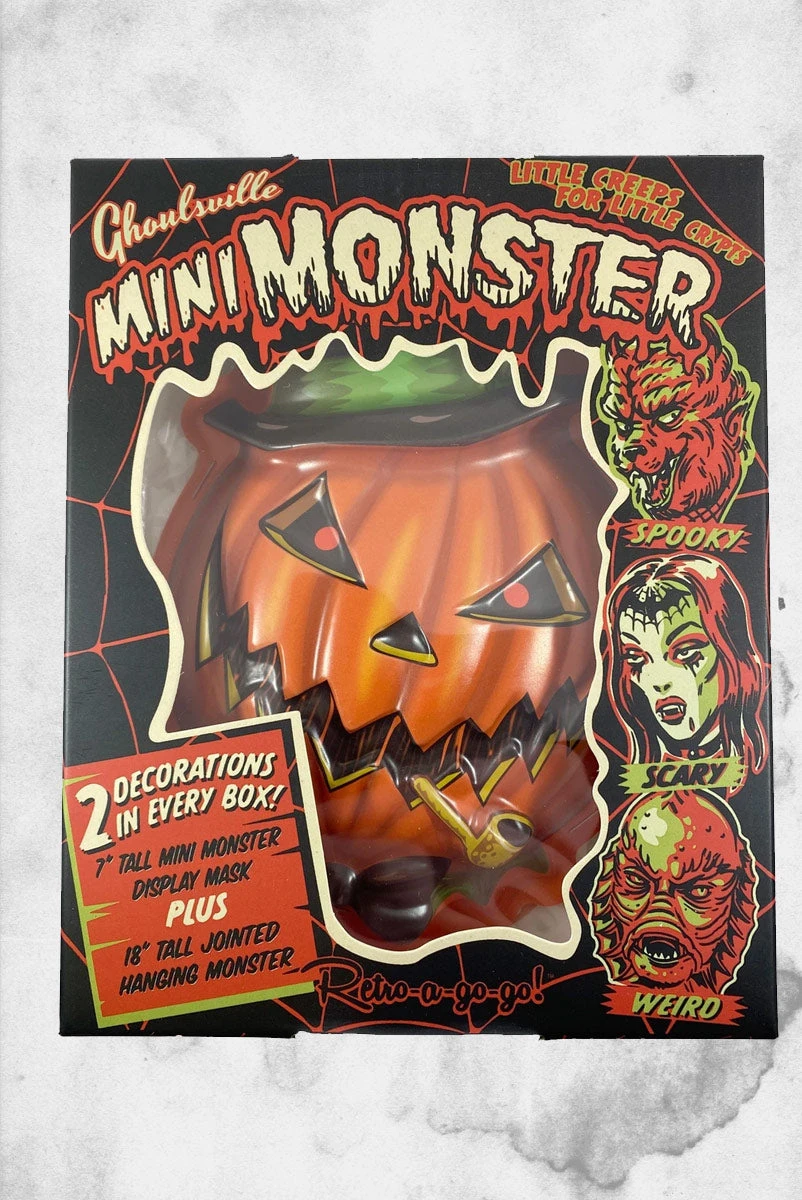 Filled with mischief, just what’s in this pumpkin’s pipe? He has a grin that just doesn’t look right! The checkered suit is just too much with the black bow tie, I think he may be stoned, look into his eyes! One thing’s for sure, he’s a stylish guy. I think he has the munchies and wants some pumpkin pie! This 1960’s inspired Goblin Gourd Mini Monster contains a 7″ tall vac-tastic plastic mini wall decor mask and an 18″ fully jointed retro figure, both packaged in a fabulous, displayable window box reminiscent of vintage Halloween costumes. Collect them all!