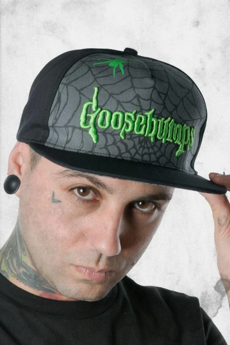 Goosebumps spiderweb logo baseball hat , embroidered Goosebumps logo on front with screen G splat under skip.