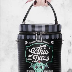 Cute and playful bucket bag – ‘Gothic Dazs’ comes in a rounded shape and printed motif to front. With zip closure – fits all yer essentials, perfect for nights out, shoots or just hanging with yer coven!