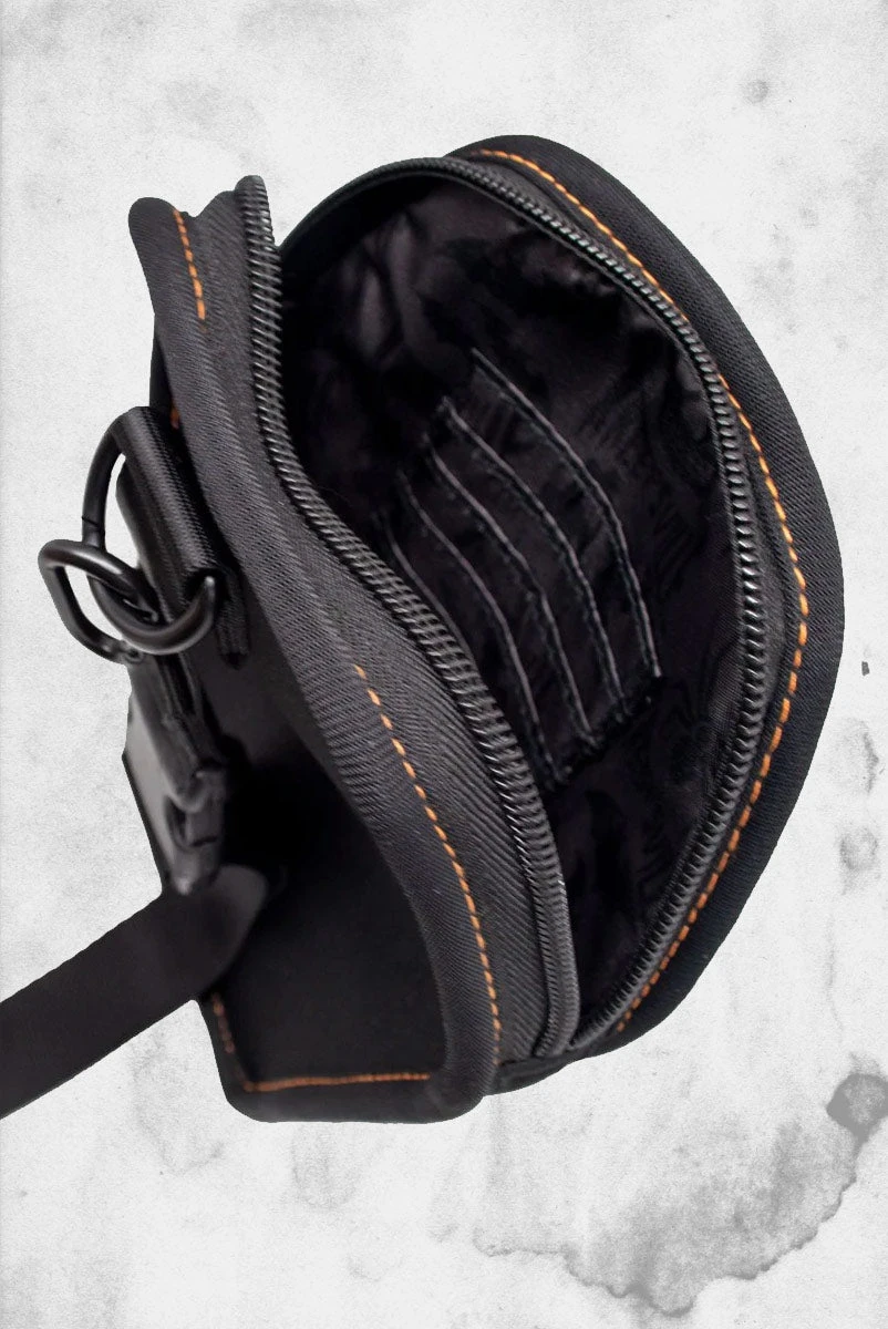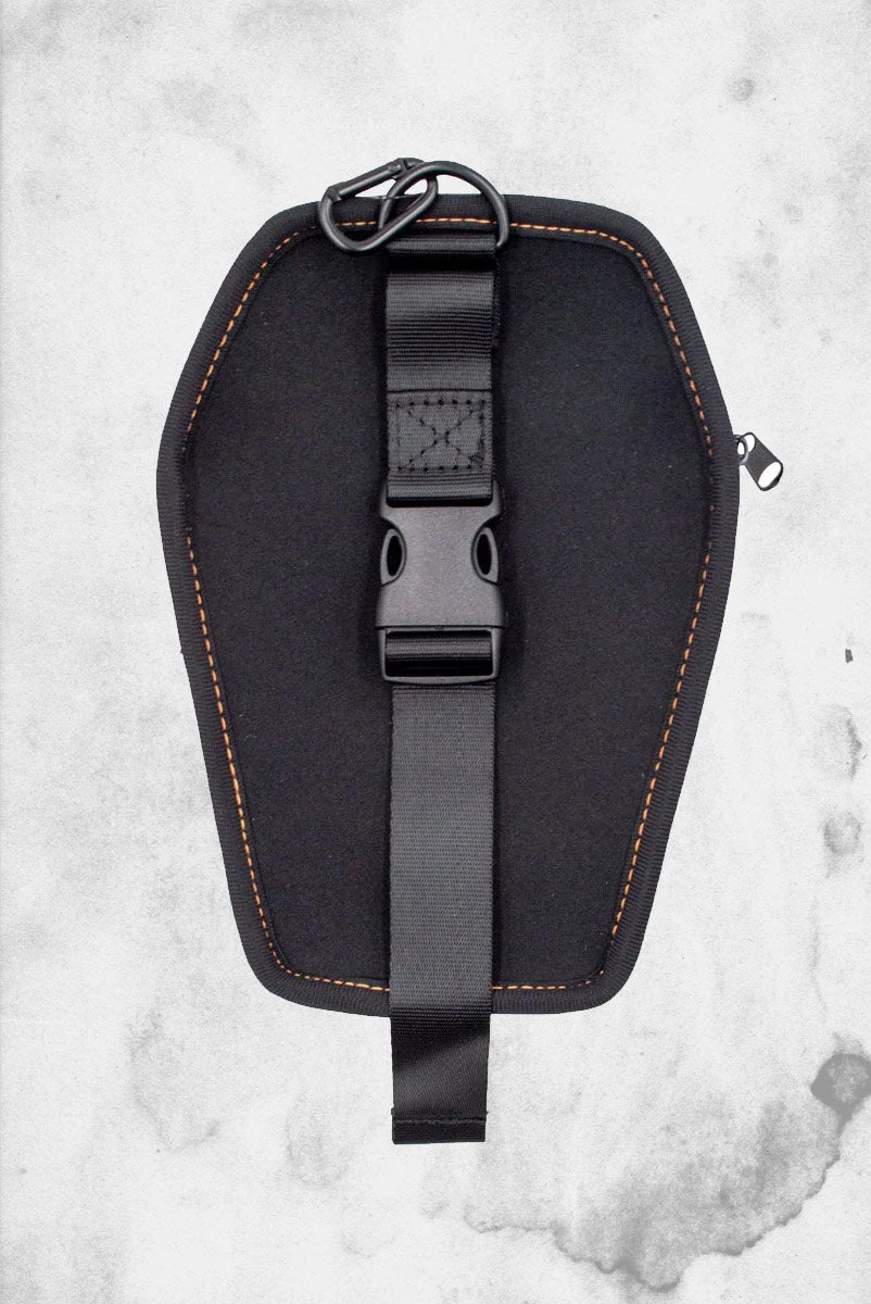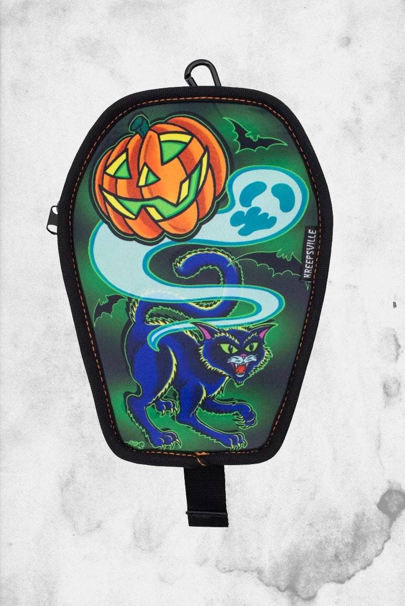 Graves Halloween Coffin Clip Pouch from Kreepsville. Coffin pouch comes with clip, adjustable strap and card sections. Clip to your bag or hip to carry your stuff, use it for phones, drives, make up, severed fingers, guitar tuners.