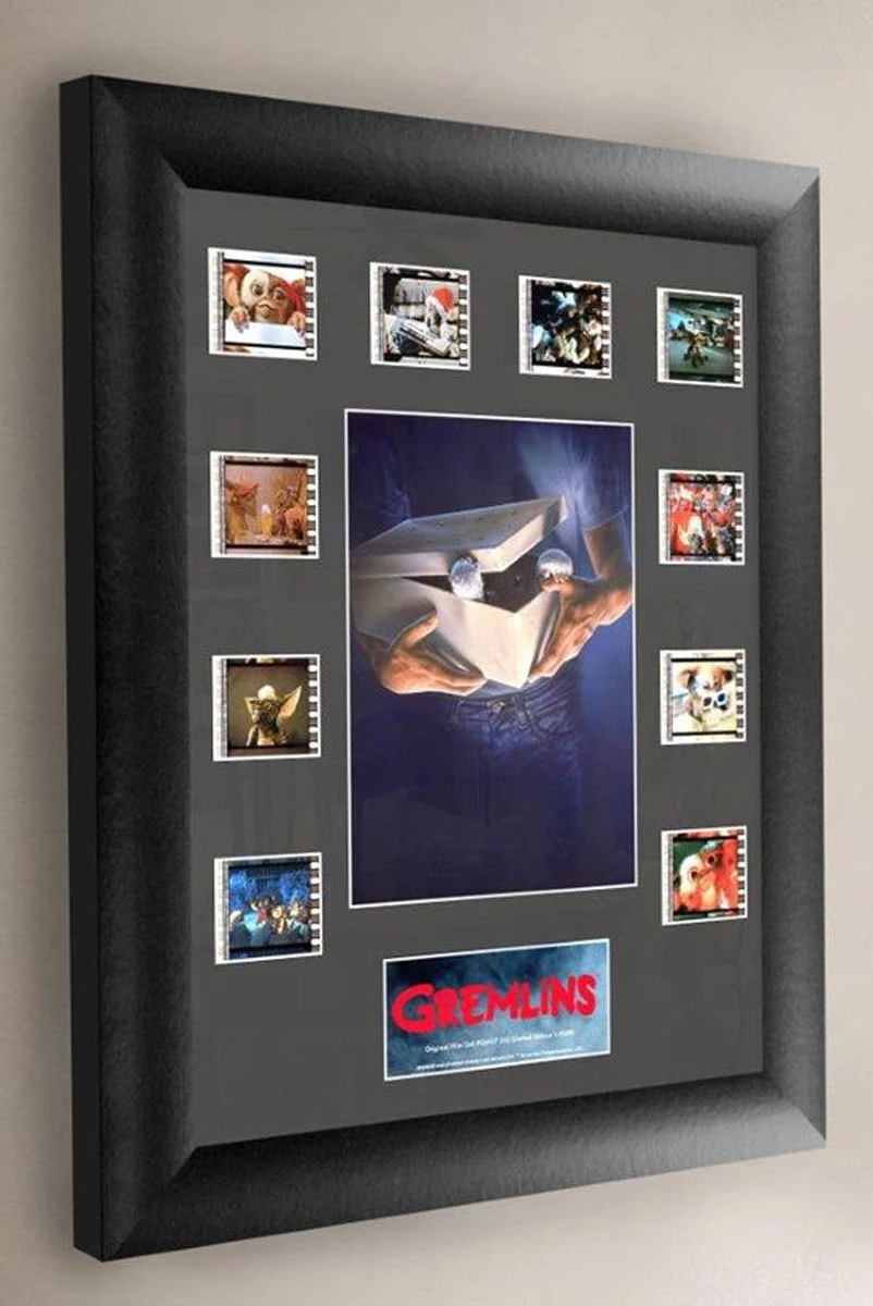 A mogwai may seem like the perfect gift, until they turn into destructive gremlins! On this 11” x 13” Mini Montage FilmCells presentation are ten 35 mm carefully handcut film clips from the movie Gremlins surrounding an image a cute mogwai in a box. This FilmCells presentation also features a numbered limited edition name plaque.