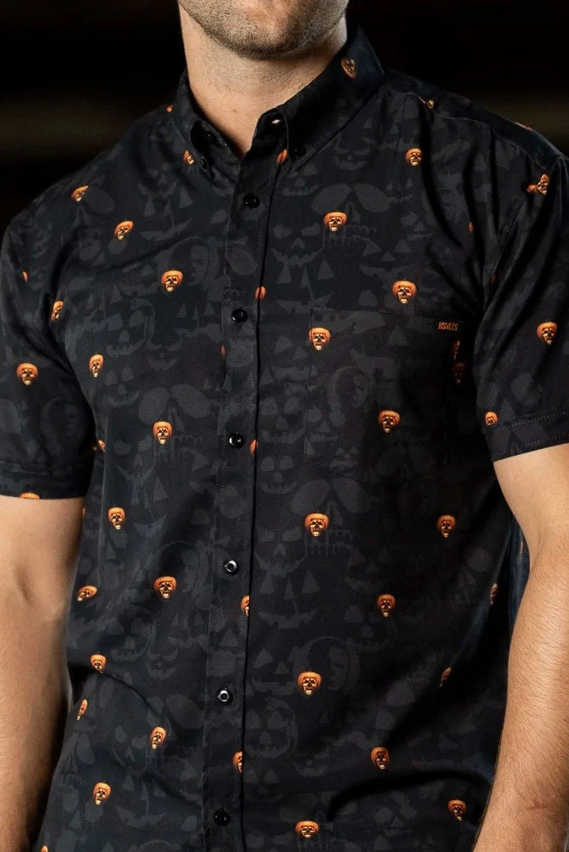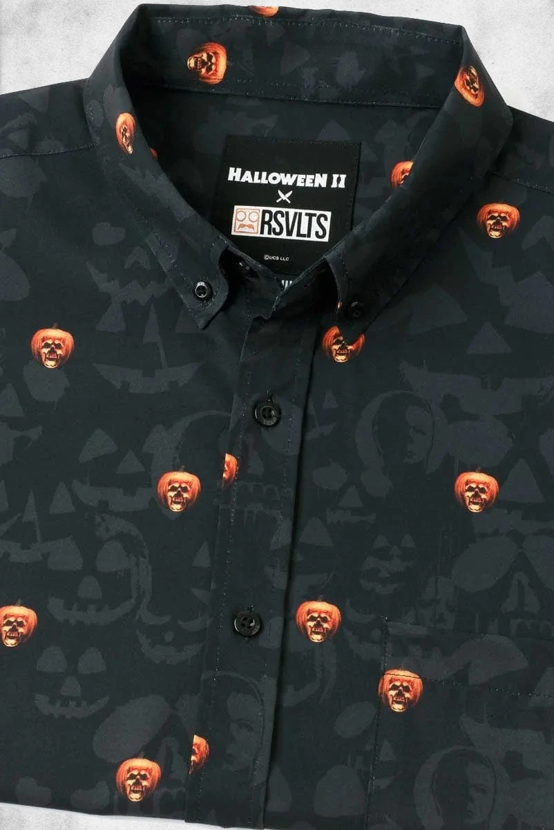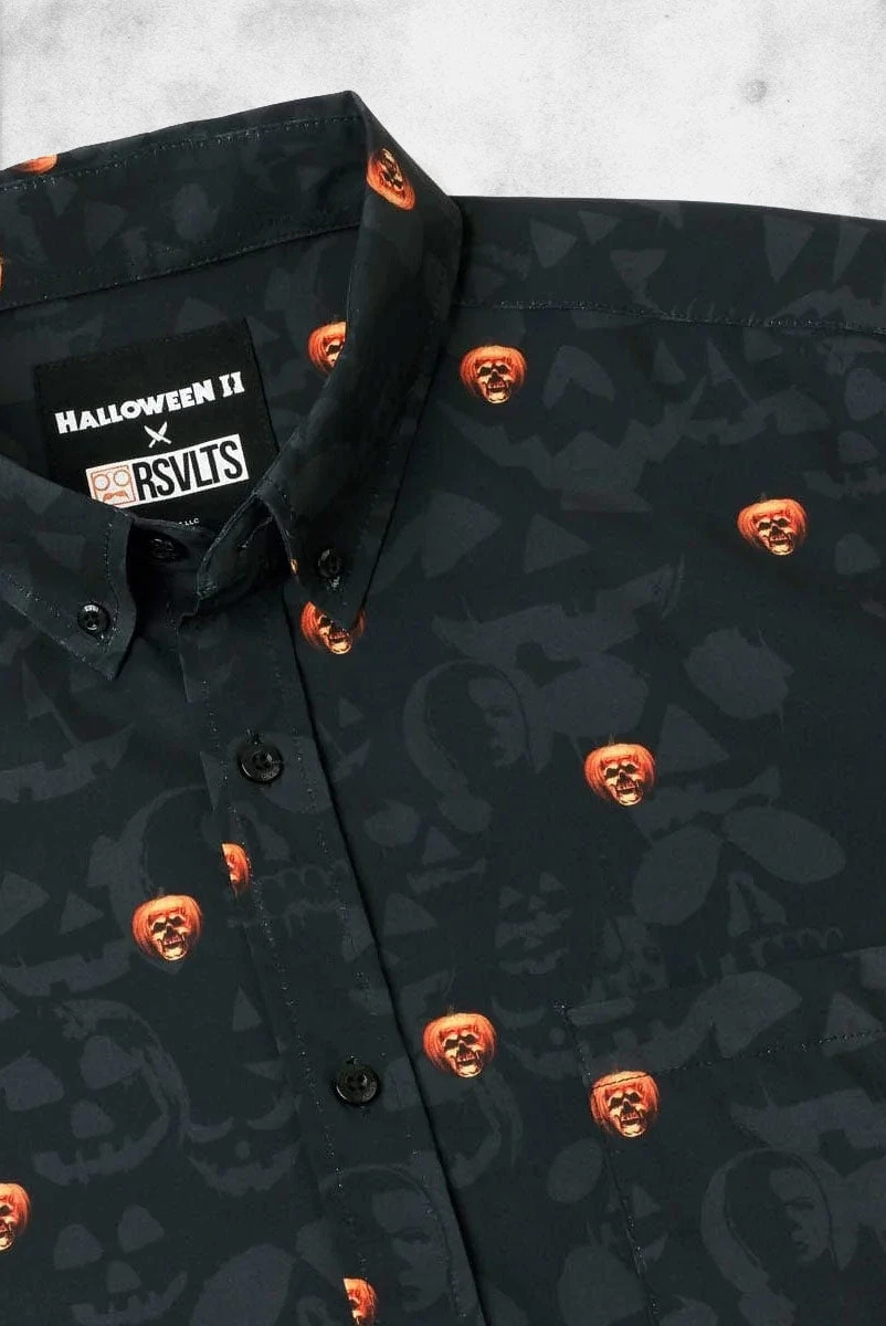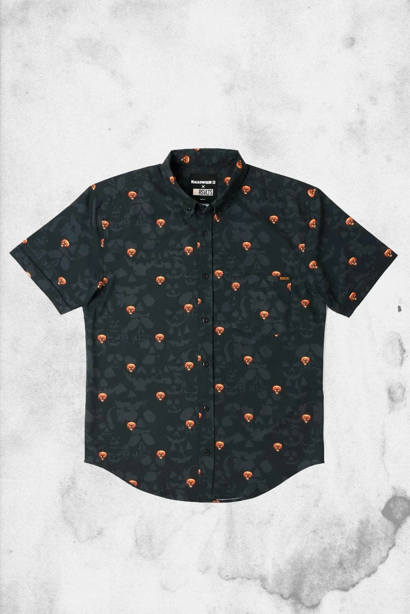 This killer KUNUFLEX™ button down features a petrifying pumpkin patch comprised of the famous skull jack-o’-lantern logo of Halloween II. It’s a scary-cool shirt for lovers of all things gore’d (pumpkin pun!!!).