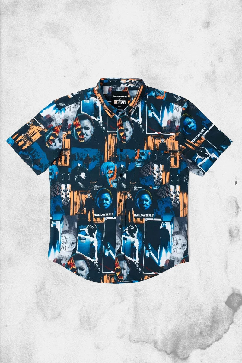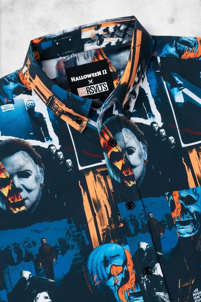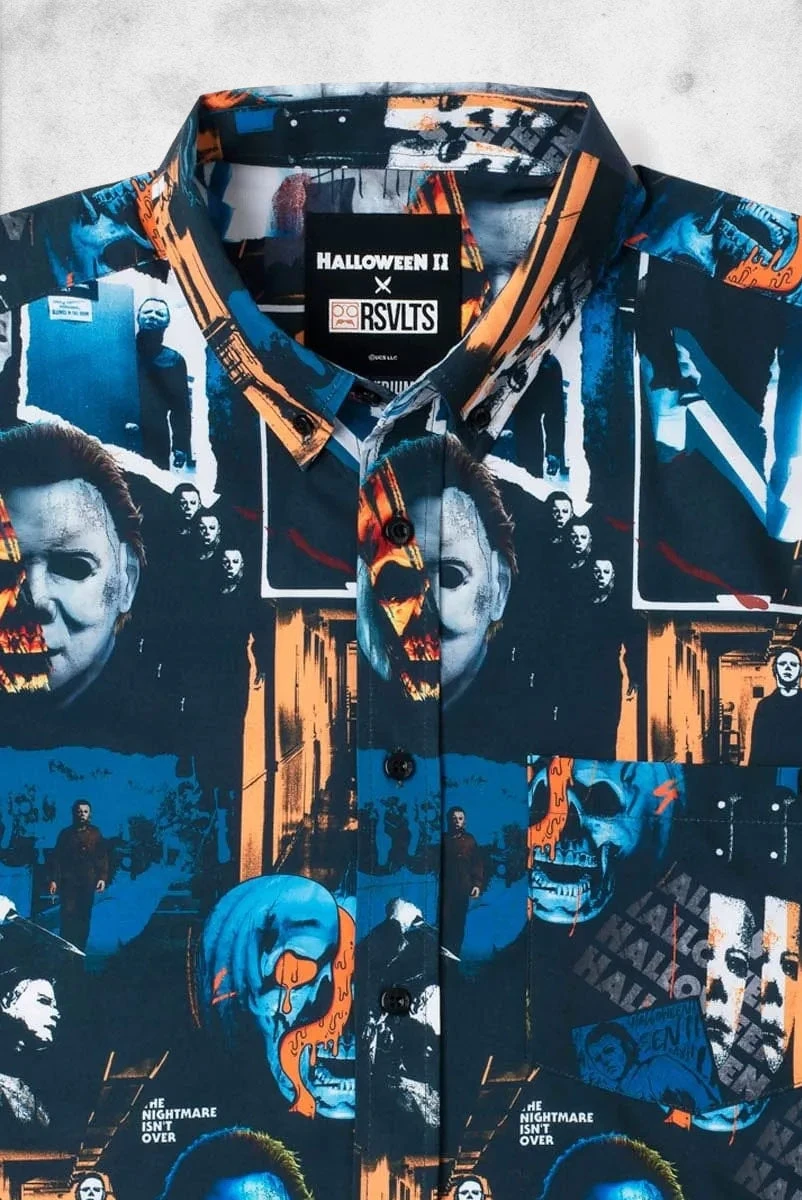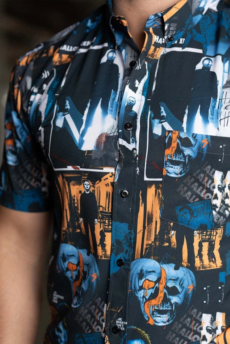 This eerie KUNUFLEX™ button down contains a creepy collage of some of the most chilling imagery associated with the second installment of the Halloween series. And look at this way: as long as Michael Myers is on your shirt, he can’t sneak up on you… you can keep telling yourself.