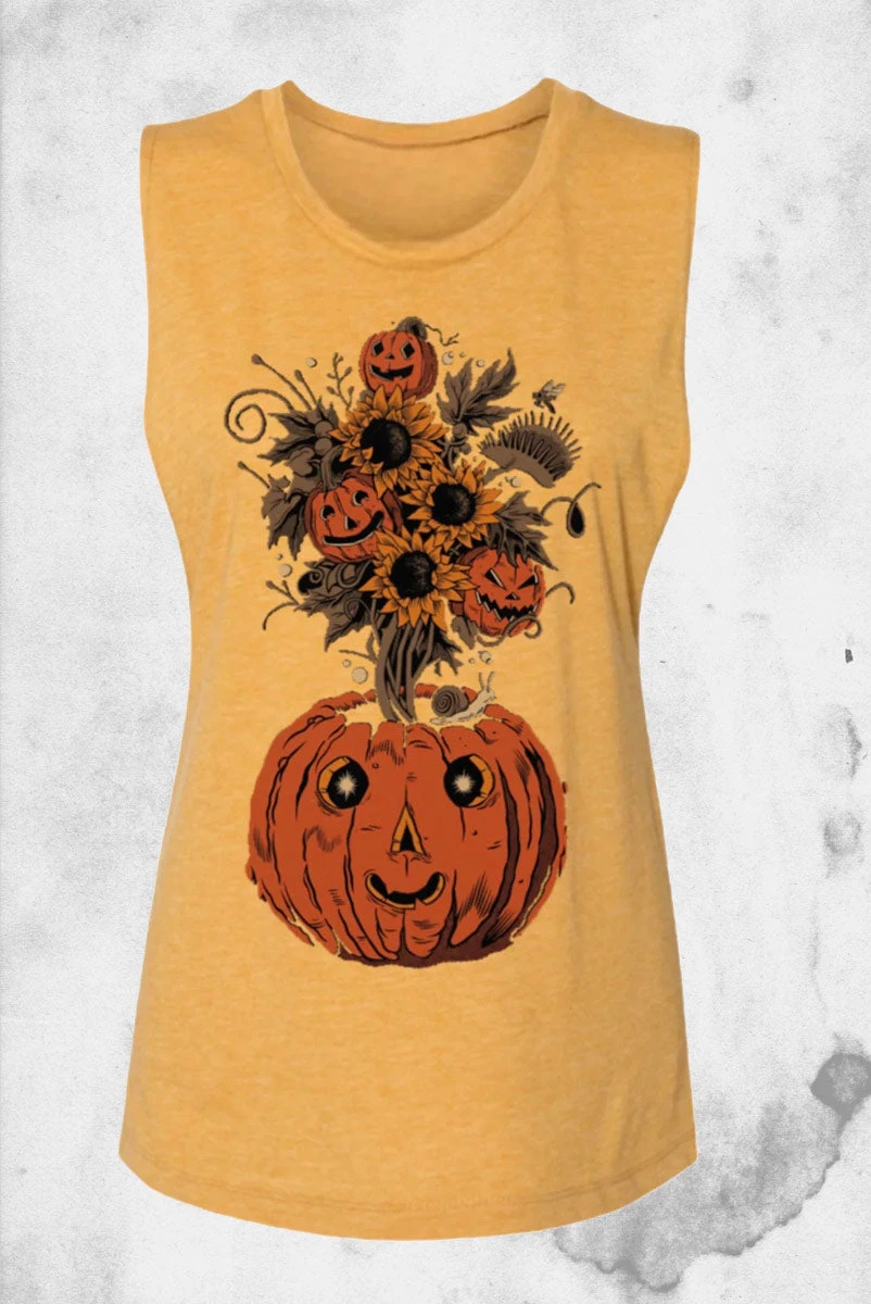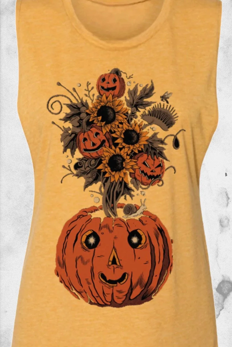 Halloween is blooming and it’s here to stay! Show your love for Halloween with this golden heather colored tank top with a fun spring/summer twist on the normal spookiest time of the year, all year-round.