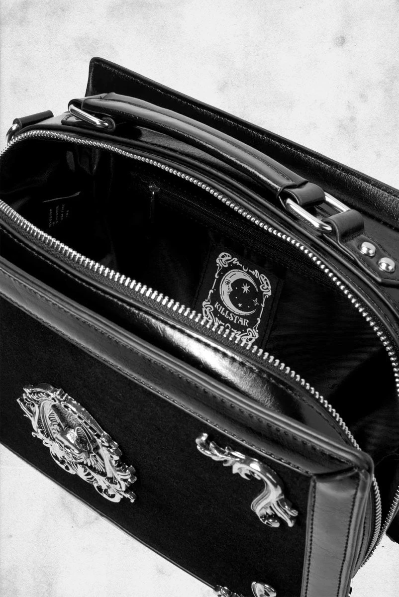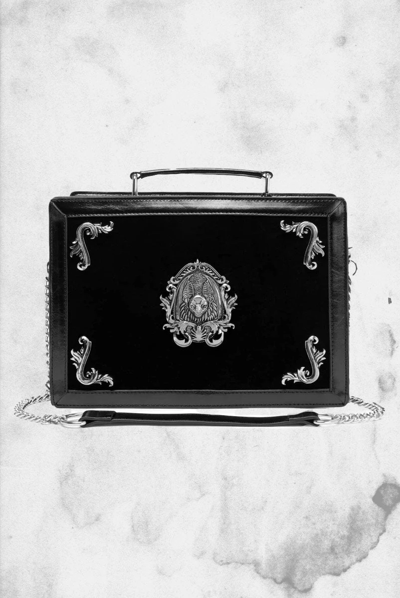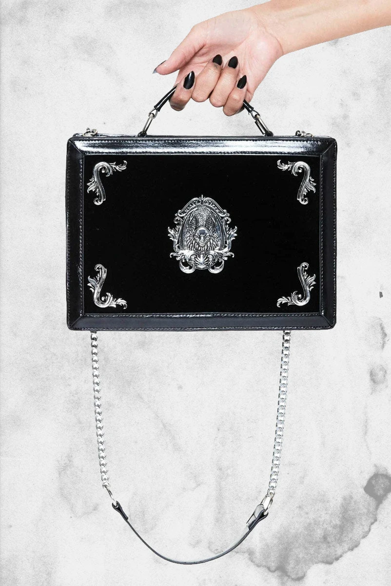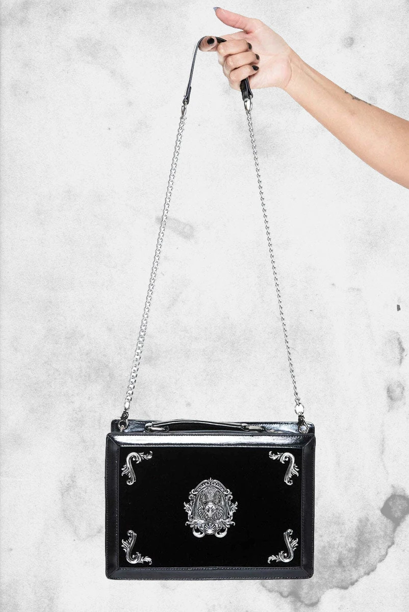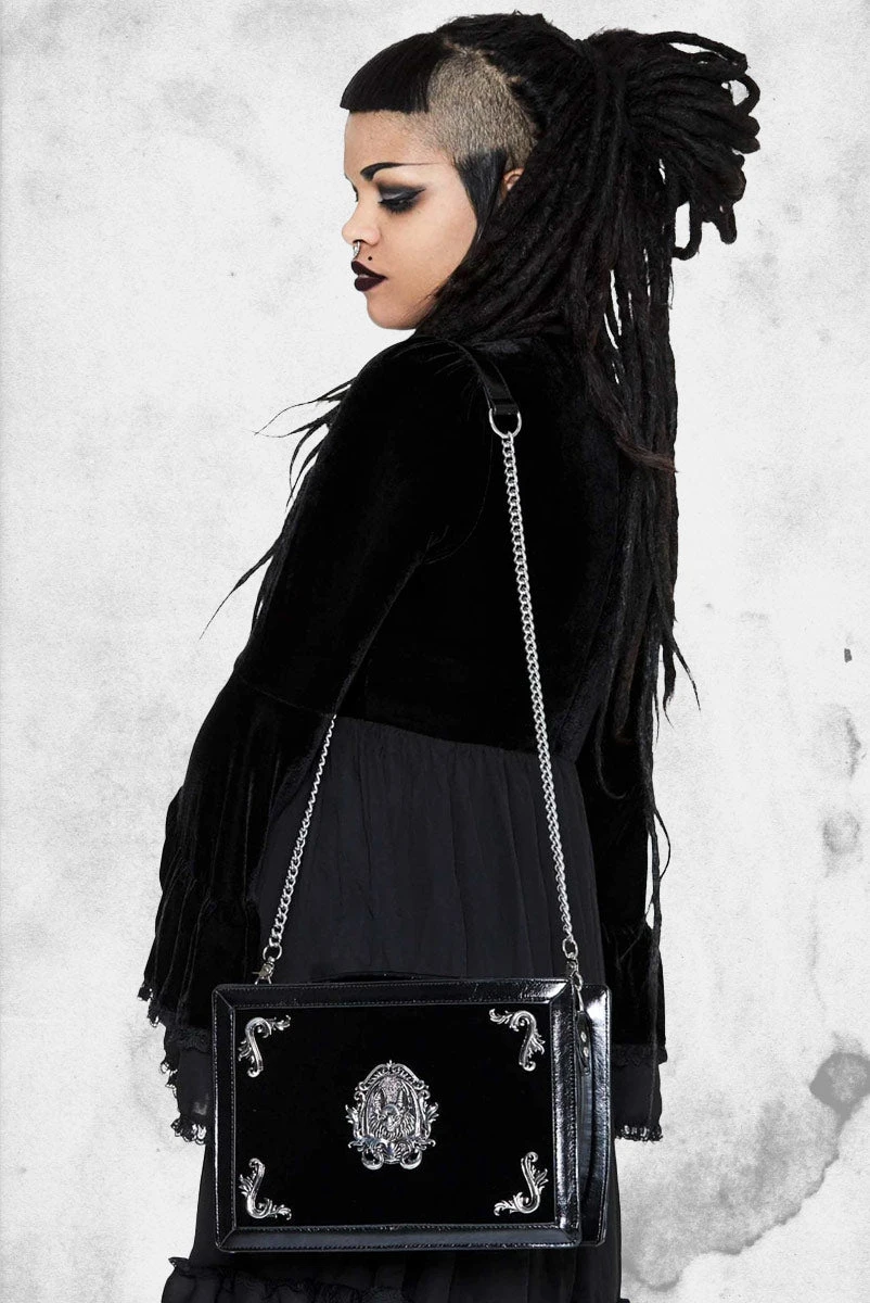 Our ‘Immortal Coil’ handbag has been summoned with a faux-leather material body featuring a statement silver hardware on the front. A classic shaped bag and chain strap. It has been foretold this is the perfect accessory for yer day-to-day adventures outside yer crypt and nighttime rituals!