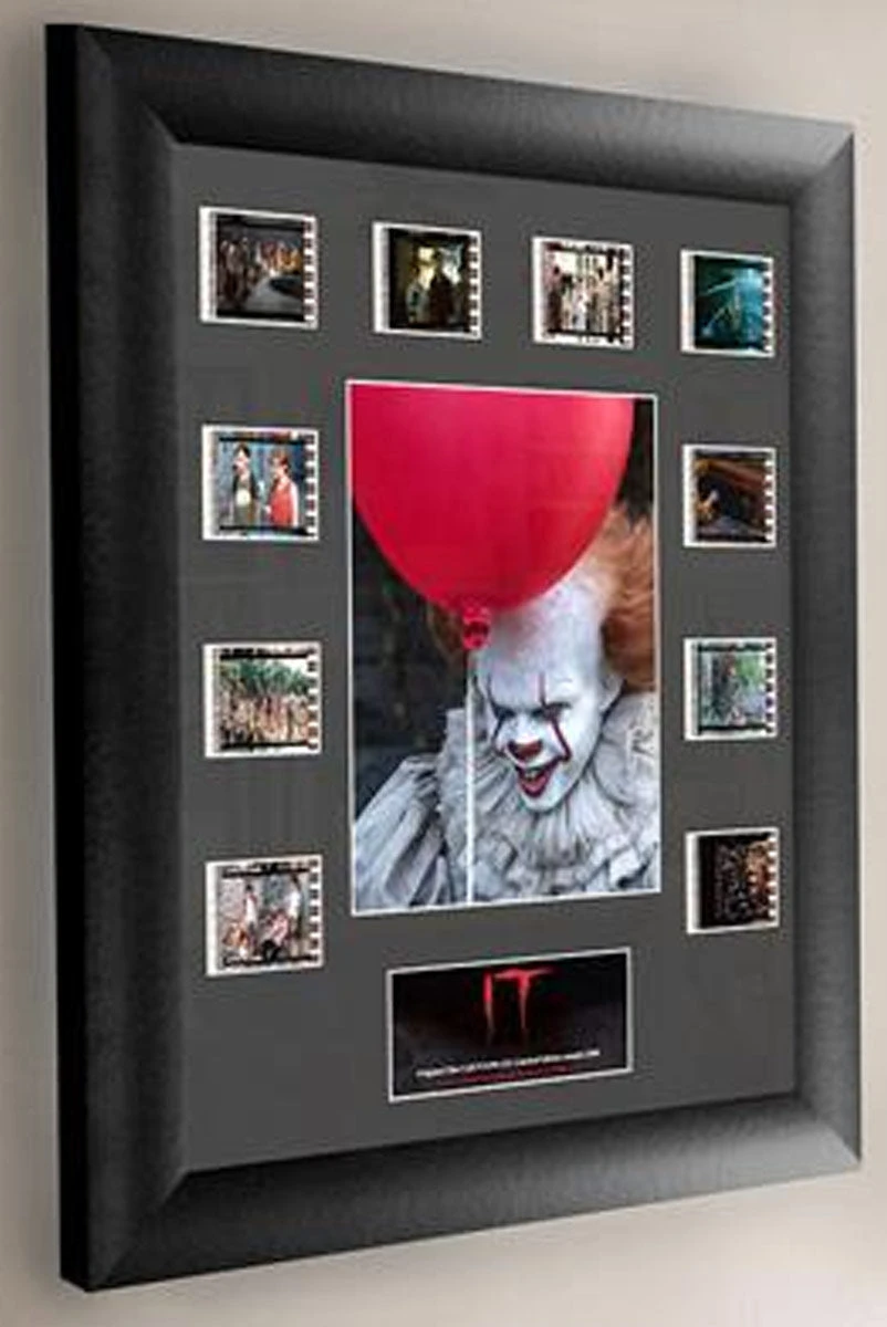 The officially licensed artwork of Pennywise the Dancing Clown and his red balloon is surrounded by authentic clips of 35mm film from the movie!
