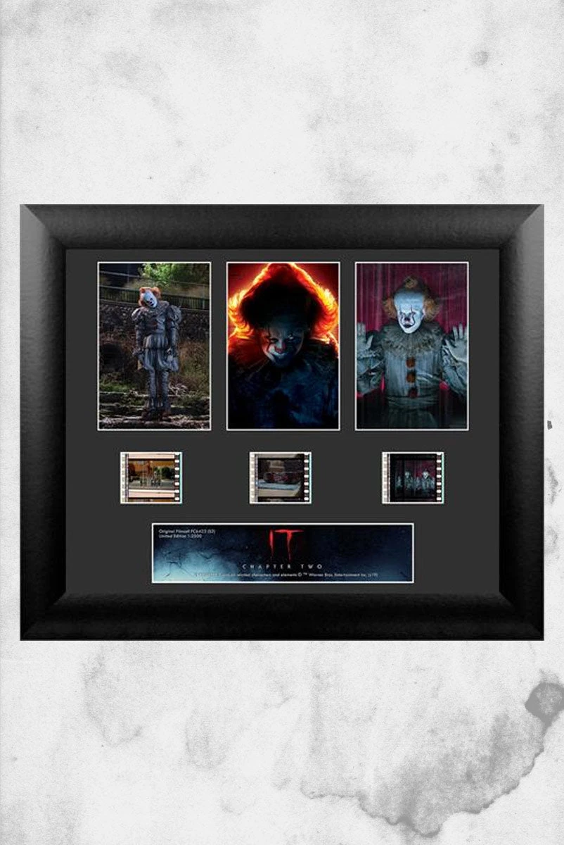 Pennywise takes center stage in this framed 3 cell standard FilmCell collectible. The Dancing Clown from IT Chapter Two is ready to welcome The Losers Club back to Derry, Maine, and wants to keep them there forever! Show off your love for the horror genre with this unique presentation, complete with three film cells from the movie.