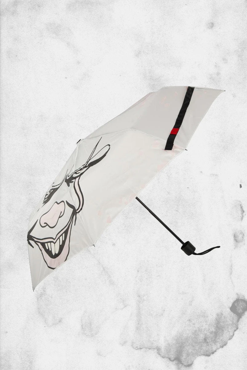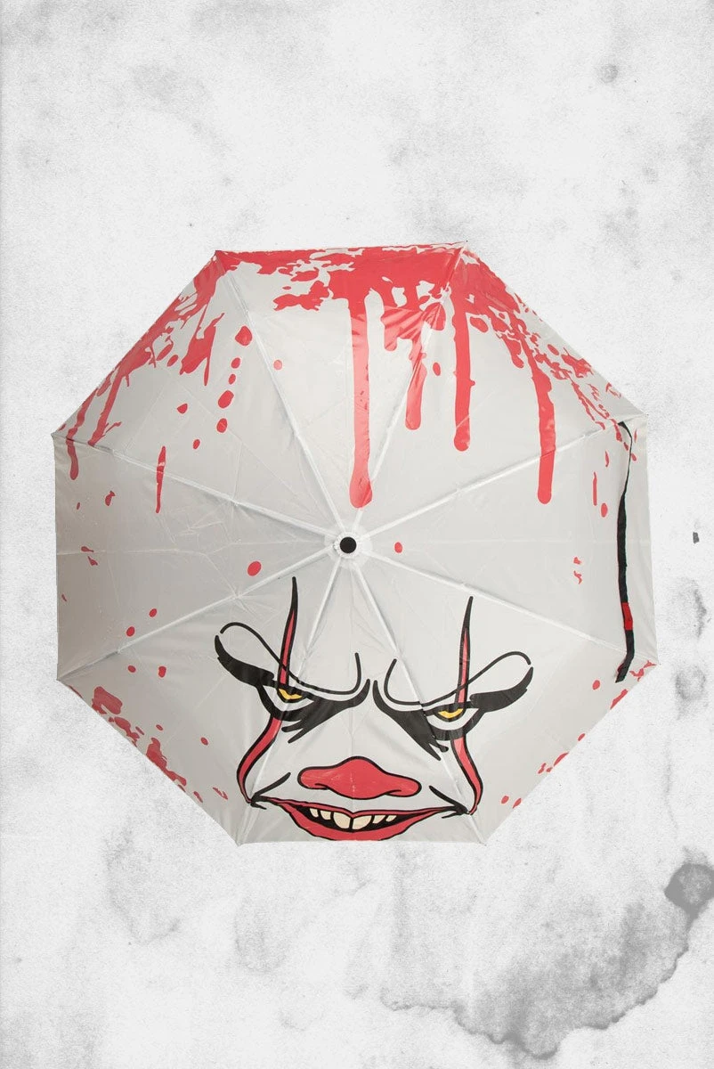 Don’t get caught unawares like Georgie the next time it rains. This IT Pennywise Face Liquid Reactive Umbrella features Pennywise’s face on a white backdrop when dry, but reveals a haunting blood splatter once wet. Featuring a compact design, sleeve, and wristlet lanyard, it’s easy to carry around next time you’re running from a murderous space clown.