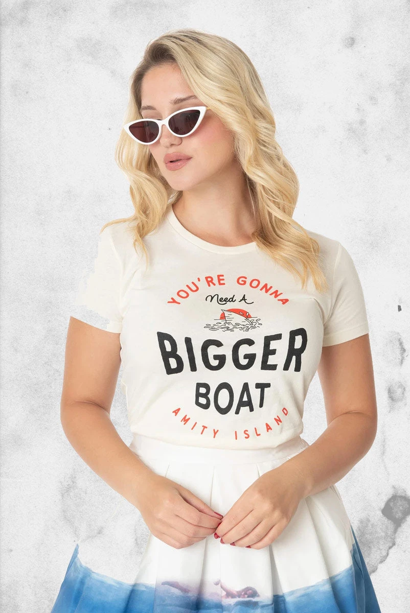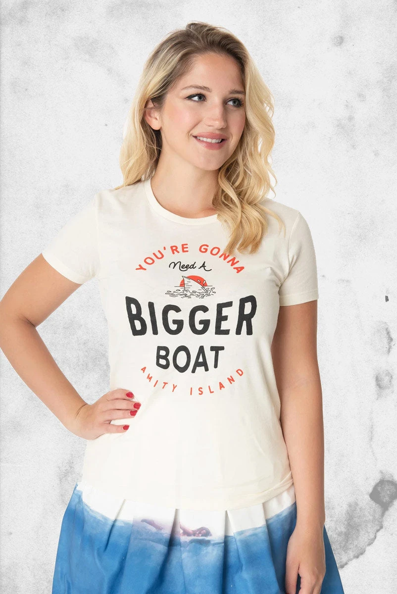 It’s our favorite boat tour, gals! A hair raising collaboration from Jaws, this thrilling women’s tee features the infamous quote ‘You’re Gonna Need A Bigger Boat’, complete with a shark fin. Cast in an off white cotton blend, this fitted women’s tee features a comfortable crew neckline and sweet short sleeves to keep you casual as you bail out the water!