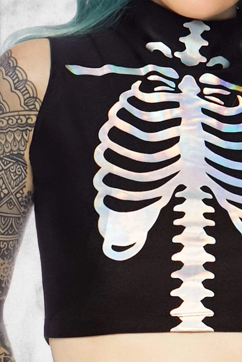 Looking to go out on the town or your next Halloween festival. This 2 PC Holographic Skeleton costume suite is perfect. This women’s skeleton costume includes a crop top and high waist shorts with attached leggings. Let your spooky and cute sideshow.