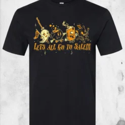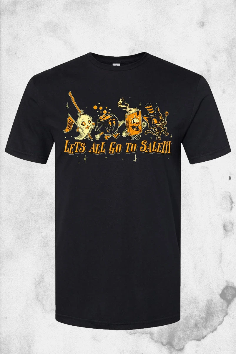 Let’s all go to Salem! Let’s all go to Salem and see what witchy stuff we can find! This classic Halloween themed shirt pays tribute to the classic movie commercial advertising you to go to the concession stand, but this time it’s going to one of the spookiest places in the world, Salem.