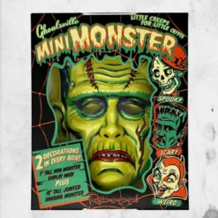 Straight from the Ghoulsville laboratory is Little Frankie. Pieced together out of used body parts, this monster is just dying to go home with you. Each Mini Monster Box Contains: 7″ Tall Ready-to-Hang Vac-tastic Plastic Mini Wall Decor Mask