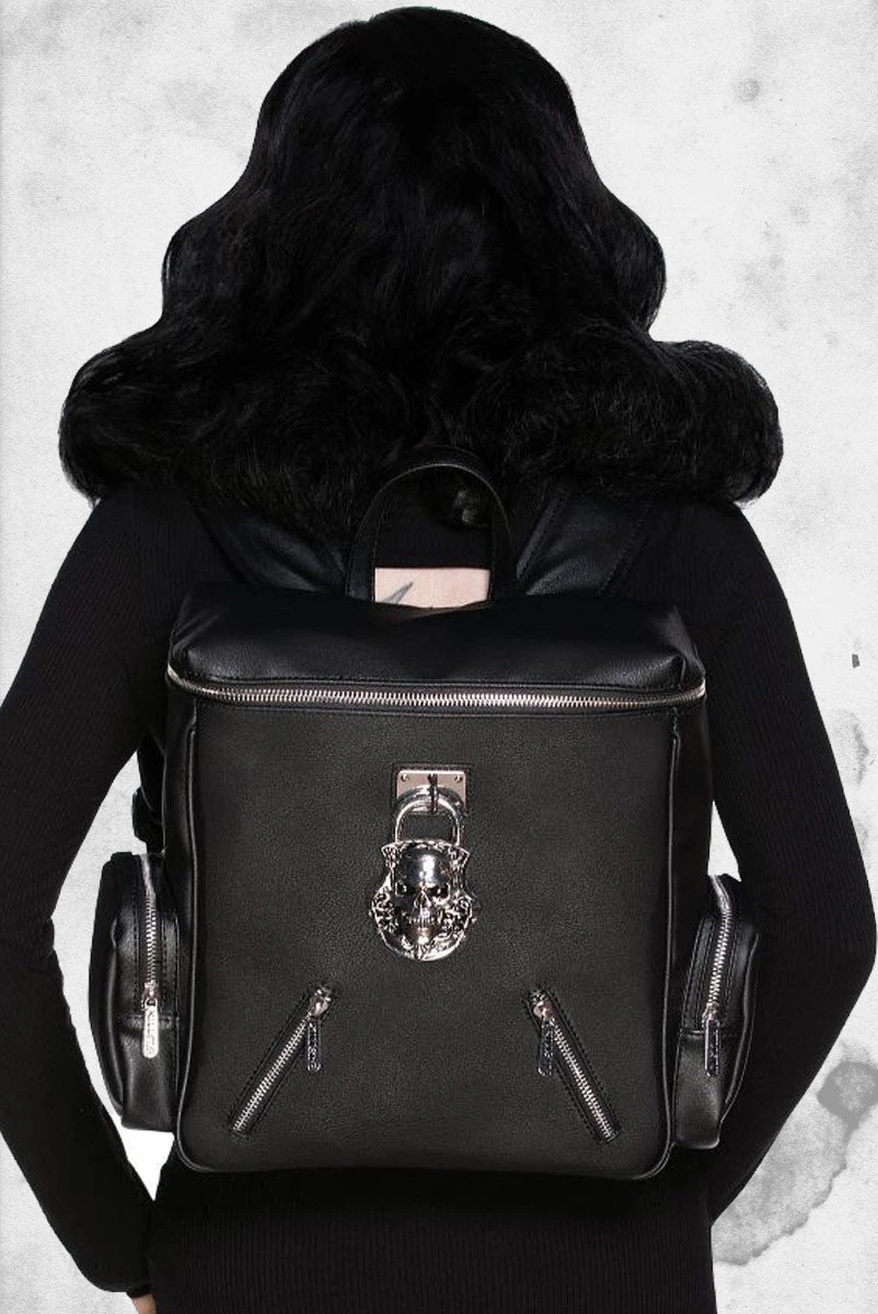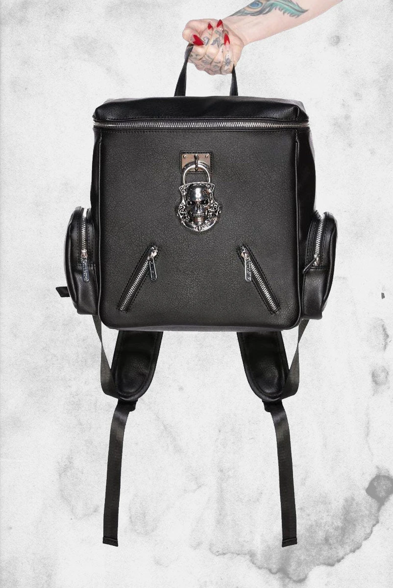 Hey, night creature! We present the lush ‘Lock Me Up’ backpack; high-quality faux-leather, skull feature, and contrasting hardware. Complete with zip closures, multi compartments, and adjustable straps. Fits all your essentials – perfect for a life in the adventure lane.