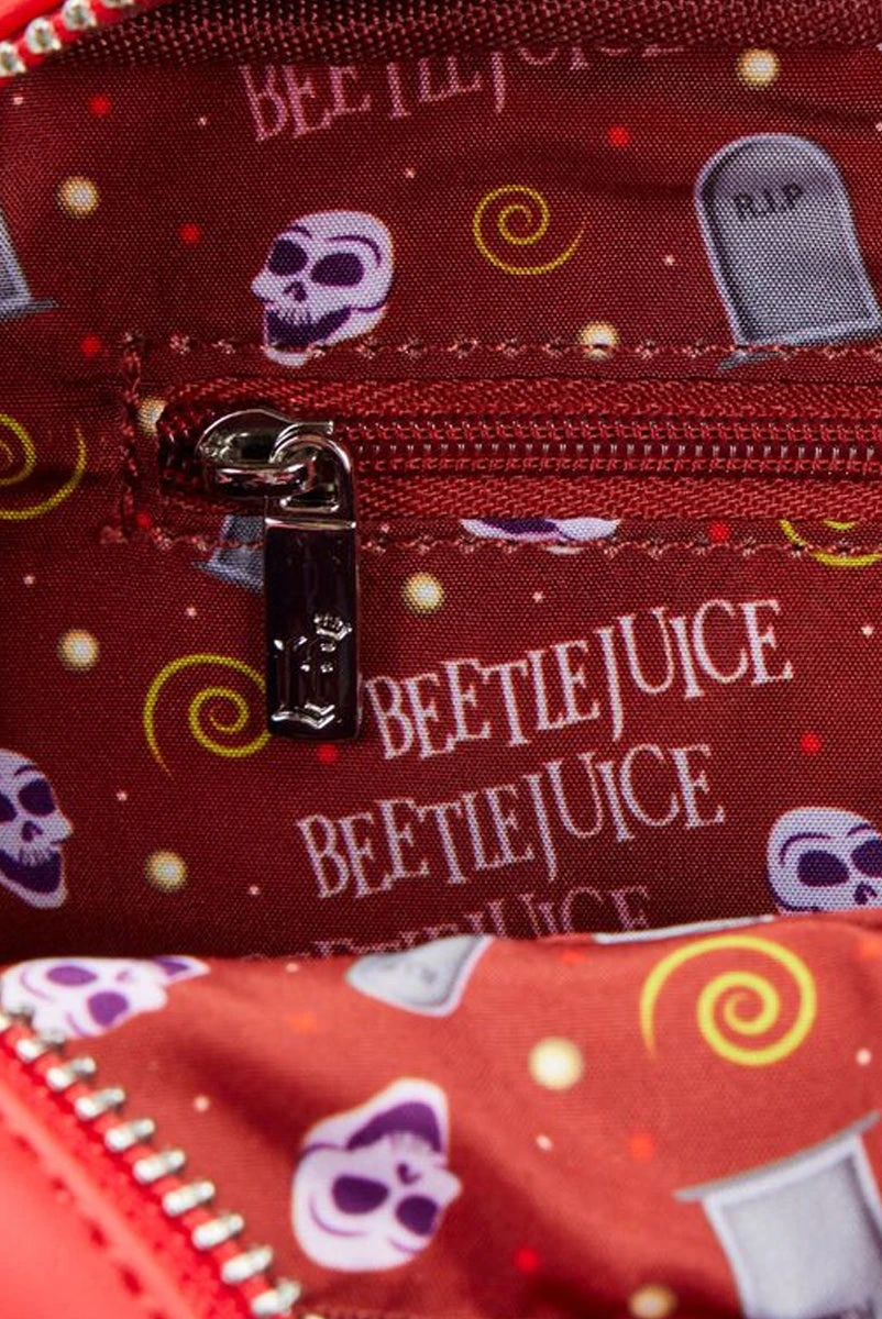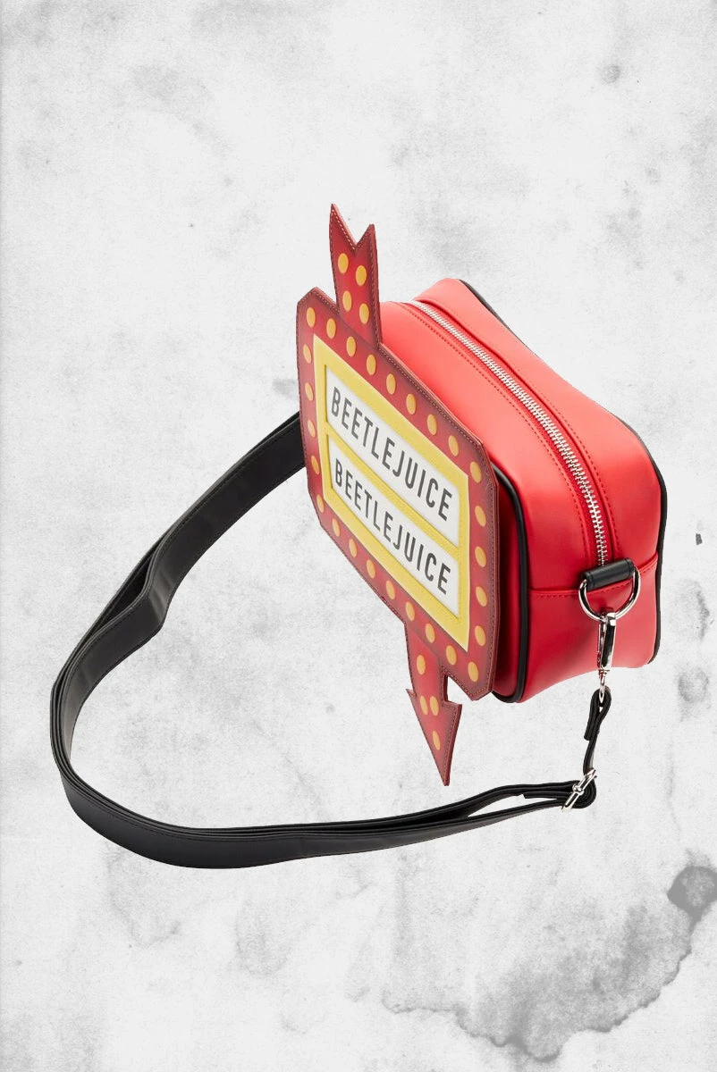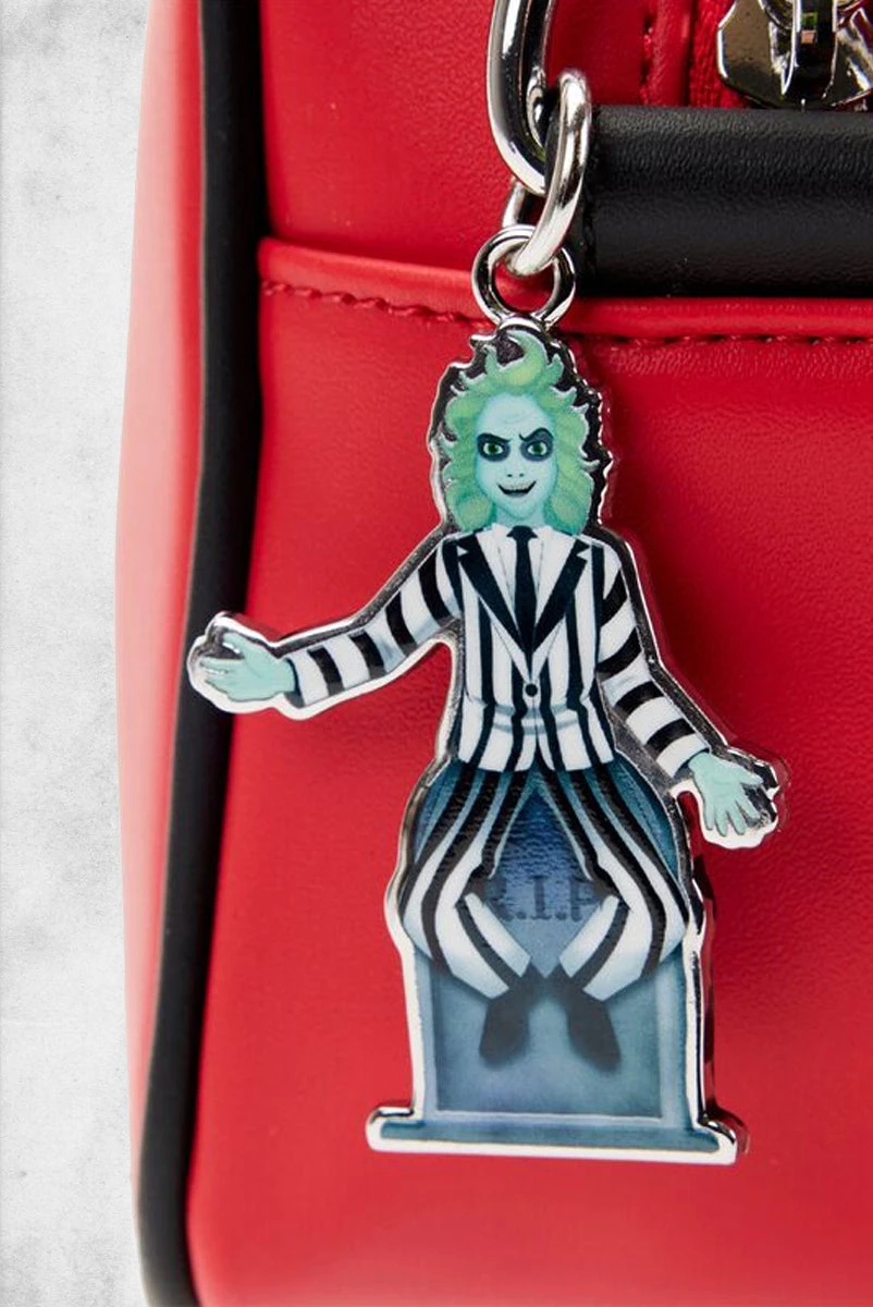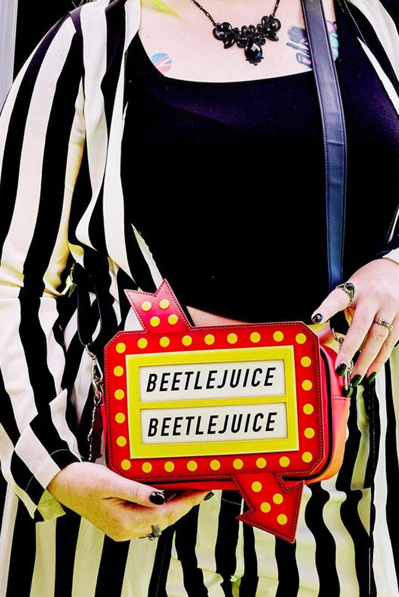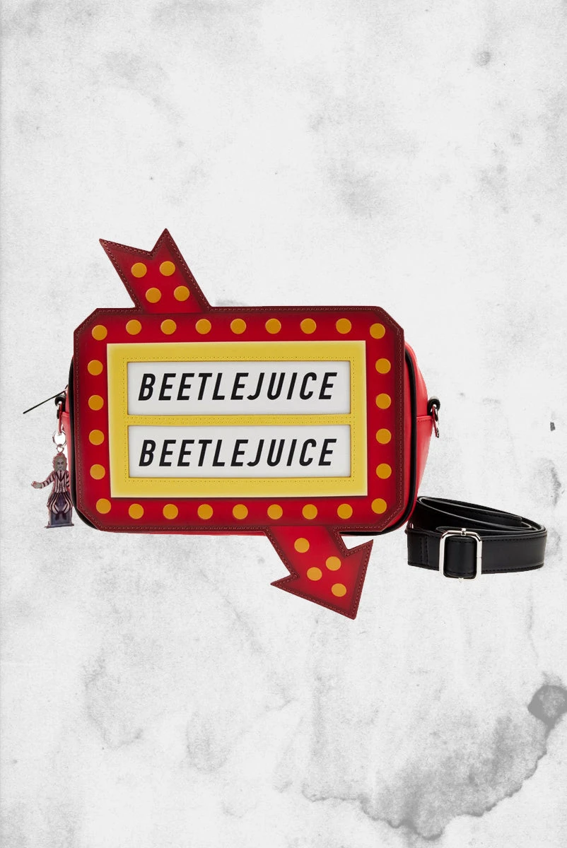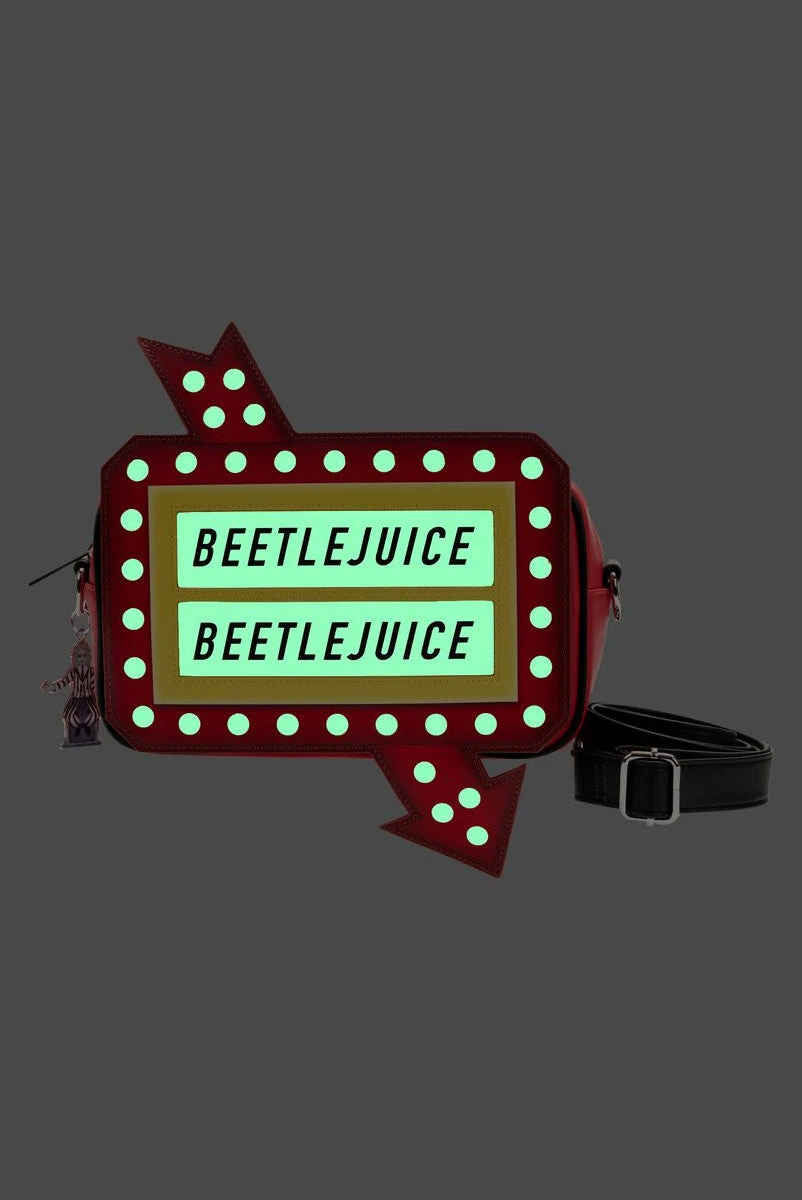 The ghost with the most is on the job! Take a terrifically terrifying trip through the afterlife with this Loungefly Beetlejuice Glow Graveyard Sign Crossbody Bag. You’ll have fun packing for an otherworldly adventure with this figural accessory, in the shape of the lighted sign and arrow, bearing Beetlejuice’s name. An enamel zipper charm of Beetlejuice tops off the look. In the dark, the lightbulbs on the sign glow! It’s the perfect accessory for packing just what you need to stay a few hours with the Deetz family in Winter River, Connecticut—or for stowing away snacks for a long wait.