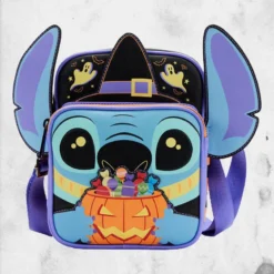 This trickster is ready for a sweet treat! Unwrap some festive fun with the Loungefly Lilo and Stitch Glow Halloween Candy Cosplay Passport Bag. On the front zipper pocket, Stitch grins down at a pumpkin-shaped basket filled with treats. Up above, a witch hat sits between his ears. Turn down the lights to see spooky, glow-in-the-dark details come to life! On the back of the bag, Stitch says the phrase “Gimme candy!” while visiting some friendly haunts. This confectionary crossbody bag will add extra flavor to any outfit and has plenty of room for storing your tricks and treats.
