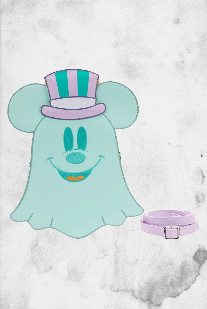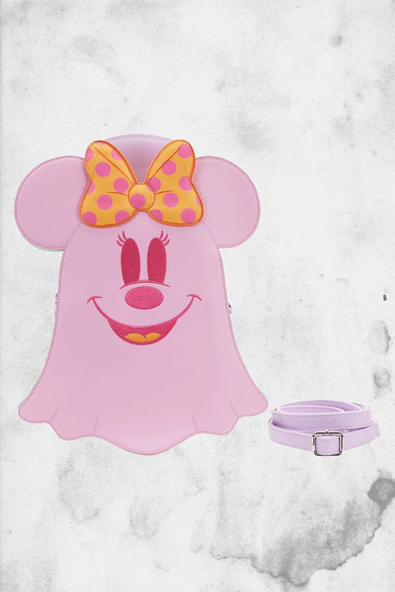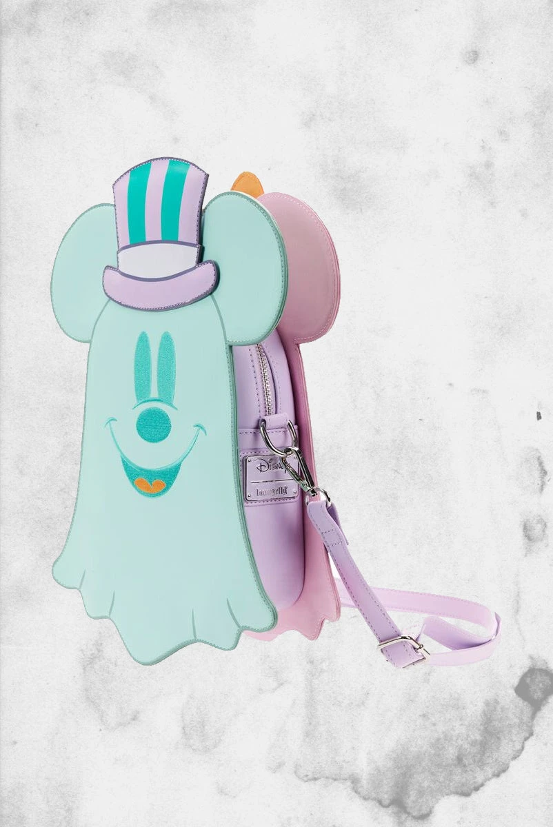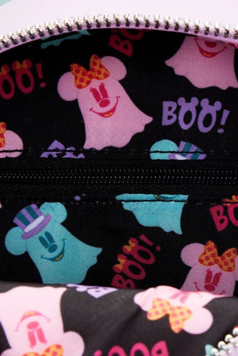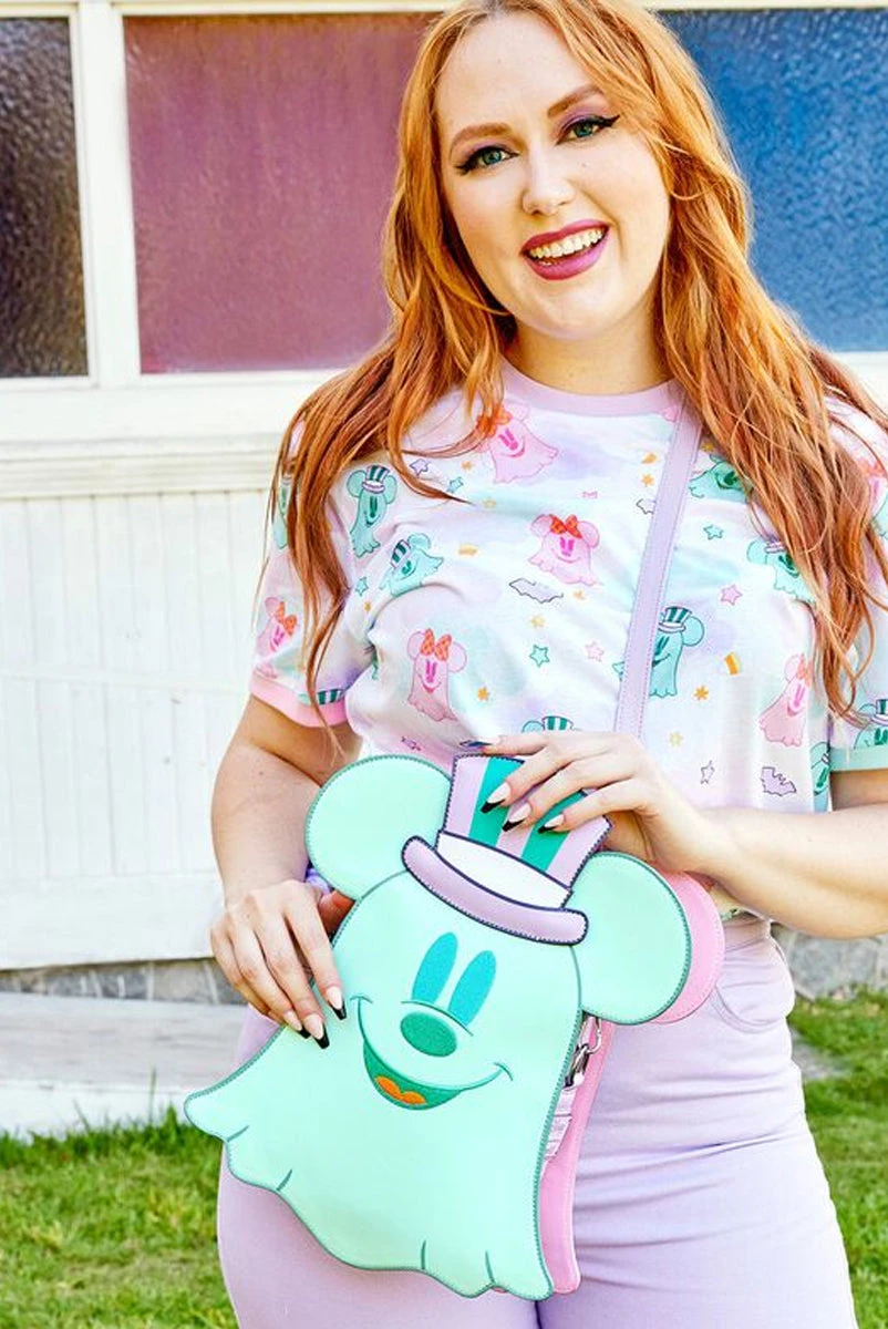 Boo-tiful adventures await with this Loungefly Disney Pastel Ghost Mickey Mouse and Minnie Mouse Glow-in-the-Dark Double Sided Crossbody Bag. Pack just what you would need for a quick spirited trip! On the front of this figural crossbody bag, applique details bring Minnie Mouse, as a pink ghost, to life. Her otherworldly ears stick up over the top of the bag, and an orange bow, sprinkled with pink polka dots, adds a terrific twist to Minnie Mouse’s classic look. On the back, Mickey Mouse, as a ghost, takes shape in a greenish blue color. His look is topped off with a violet top hat with green stripes. Turn out the lights for a double dose of devilishly delightful details: The bodies of both ghosts—on both sides—glow! It’s the perfect accessory to take for a ghost tour—or for visiting any of your daily haunts.