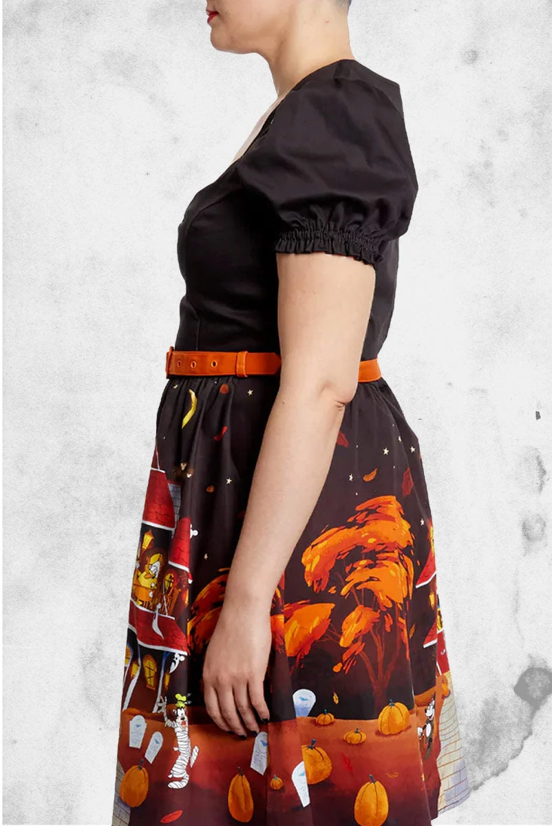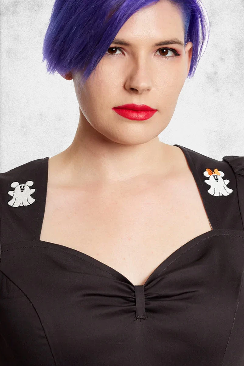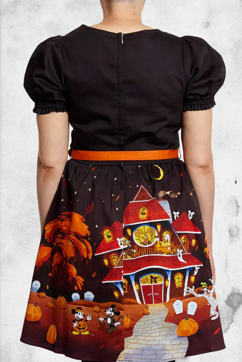 Be scary fashionable this Halloween with the Stitch Shoppe Disney Haunted House Allison Dress. This dress features a Queen Anne neckline, pockets, puffed quarter sleeves, and a glow-in-the-dark ghost on each shoulder. The glow ghosts that grace the shoulders of this garment are embroidered. All along the skirt portion of the dress, the spooky Autumn scene unfolds with ghosts appearing here and there with Donald, Daisy, Pluto, Goofy, Mickey, and Minnie Mouse.